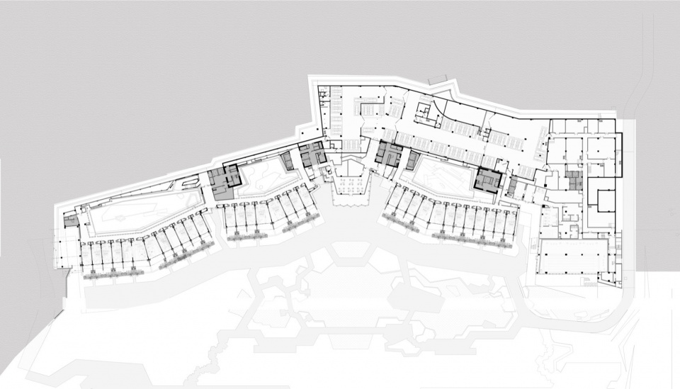酒店的主要功能沿瀑布主景一字展开,每个功能空间都能享受到独有的瀑布景观。大堂居中设置正对瀑布,成为视觉与动线的核心;大堂、大堂吧、岩石餐厅在中部垂直贯通、餐饮公区架空在大堂上部;客房分置于大堂的左右;宴会和康体娱乐功能布置在最东侧,可以独立使用的同时,也隔离了部分道路噪音对酒店的影响。