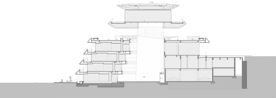 于是,我们从整体环境为切入点,梳理整体竖向高差关系,利用场地与河岸10M的高差,采用下沉的设计手法,弱化建筑体量,让建筑消解在用地与绛溪河水面之间。客房逐级跌落融入环境,公区架空在其之上,酒店在入口侧仅有2层体量,掩映在环境之中,与周边展园等建筑协调呼应。同时,逐级跌落的形态也将酒店功能自然延伸到了河岸,给酒店扩充了更加丰富的室外活动和轻水空间,丰富了酒店的入住体验。
