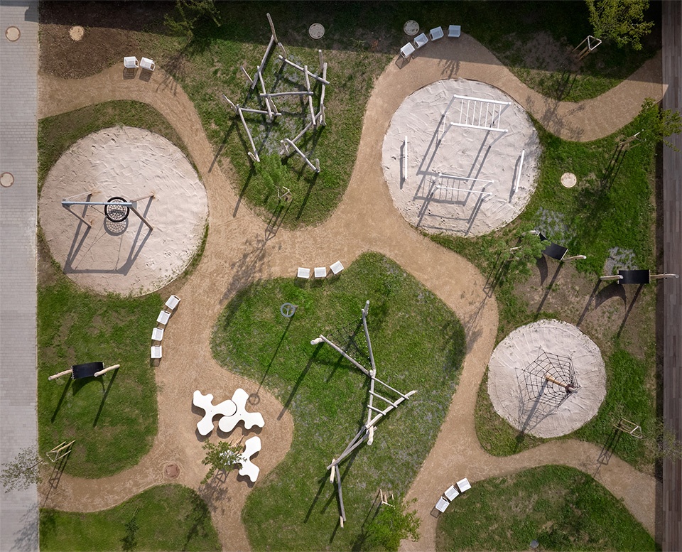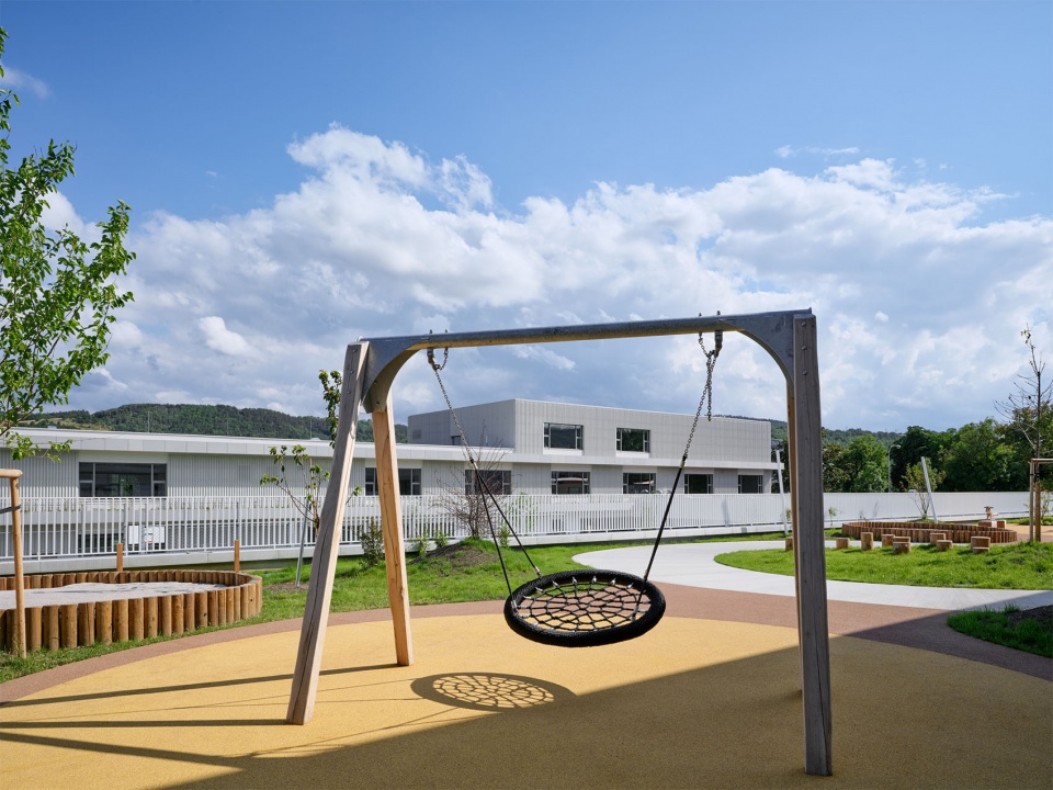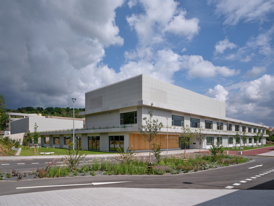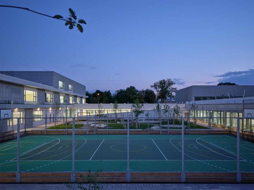 绿化则是贯穿整个校园的核心要素:茂密的树木与草地环绕建筑并延伸至庭院,使庭院成为校园的“绿色心脏”。庭院内设有草坪、乔木以及带有花坛与温室的教学花园,周围的操场延伸至起伏的草坡。大面积的玻璃立面让校园内外的生机与活动彼此可见;上层混凝土窗台上设有草本植物花槽,进一步强化自然的介入。屋顶包括密植灌木与小树的绿化区及开放草地,并配备户外家具、健身设施与互动装置,提供运动、创造与交流的空间。整座校园以波纹白色金属板立面为统一语言,将所有功能部分流畅地整合为一个学习、游戏与社交的日常中心。