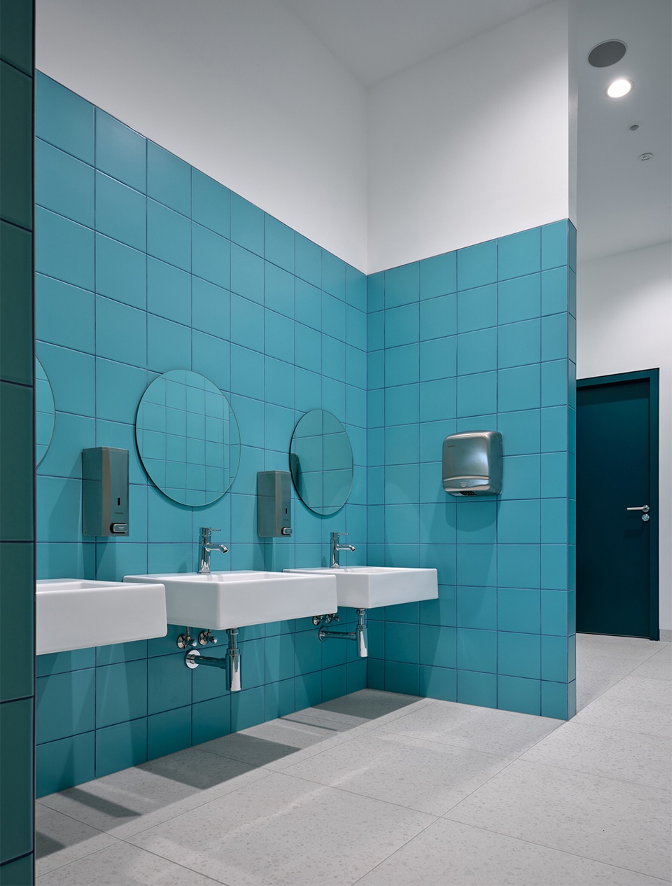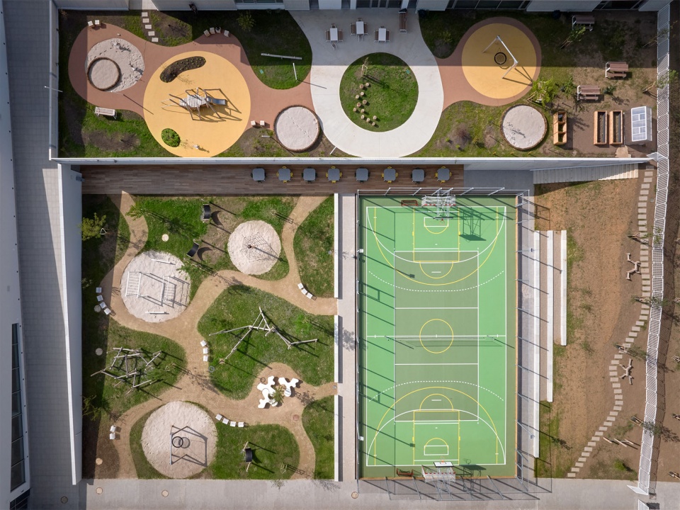 Greenery is a prominent element that permeates the entire school: rich plantings of trees and grasses surround the building and fill the courtyard, which serves as a green heart of the complex. The courtyard features lawns, trees, and an educational garden with raised beds and a greenhouse, while adjacent playgrounds lead to a grassy slope. Extensive glazing allows the vibrant life of the campus to be seen from every angle, and on the upper floors, planters with grasses rest on concrete window sills. Rooftops host both intensive green roofs with shrubs and small trees and extensive green spaces, complemented by outdoor furniture, exercise installations, and playful elements that provide opportunities for movement, creativity, and connection. The entire concept is unified by a playful façade of corrugated white sheet metal, seamlessly connecting all its parts into a daily hub of learning, play, and social interaction.