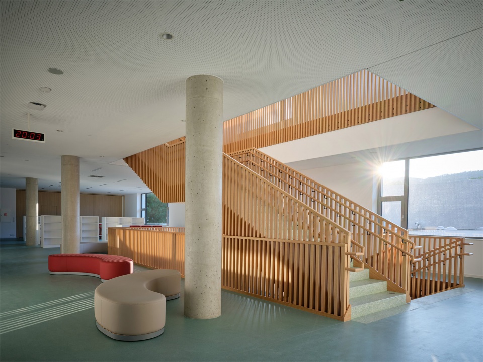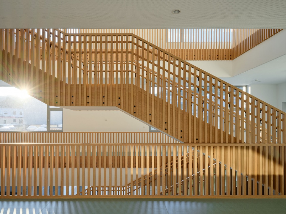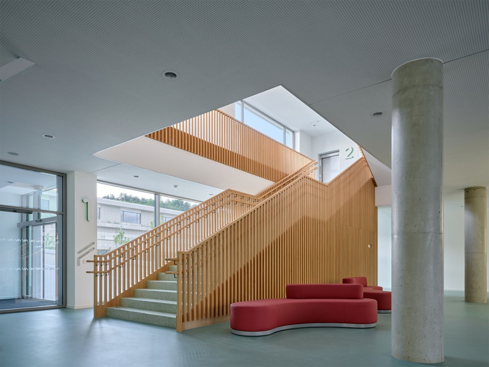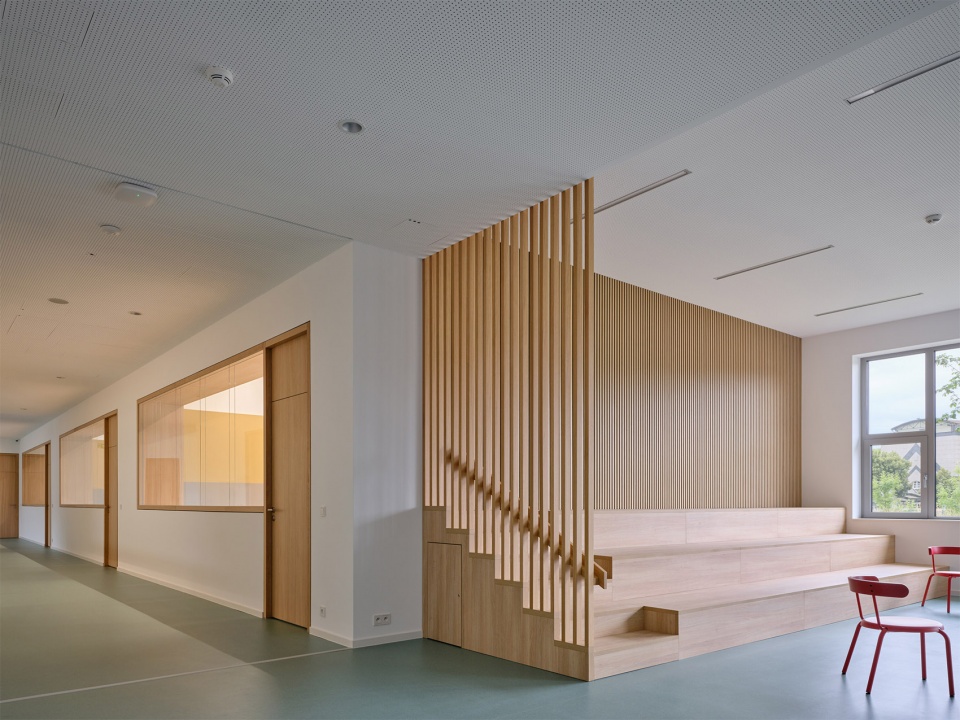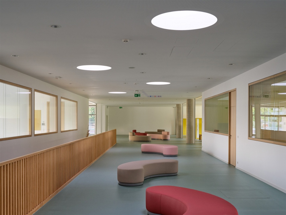 建筑内部以精心挑选的材料来强调代表性特征。该项目主要使用木材与水磨石地面并特别关注走廊的使用体验,宽敞的空间内布置了多种类型的座椅,并能透过玻璃窗看到教室内的活动。走廊不仅是儿童相遇、玩耍与自主学习的场所,也成为开展多样学习与课外活动的延伸空间。小学的教室与实验室均为灵活、开阔的空间,配备多样座位布置与现代化教学设备。