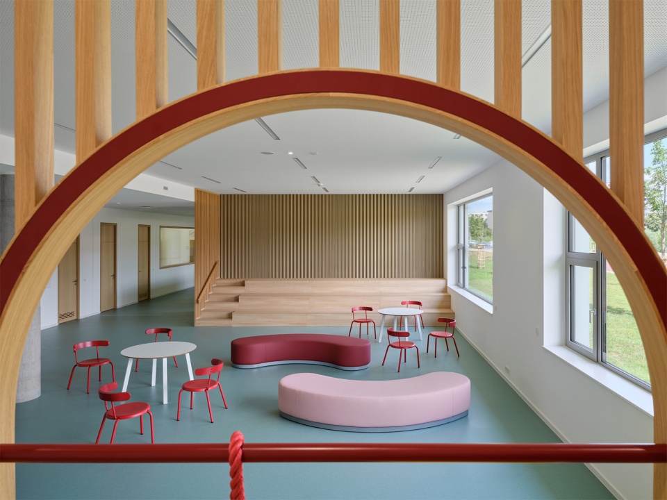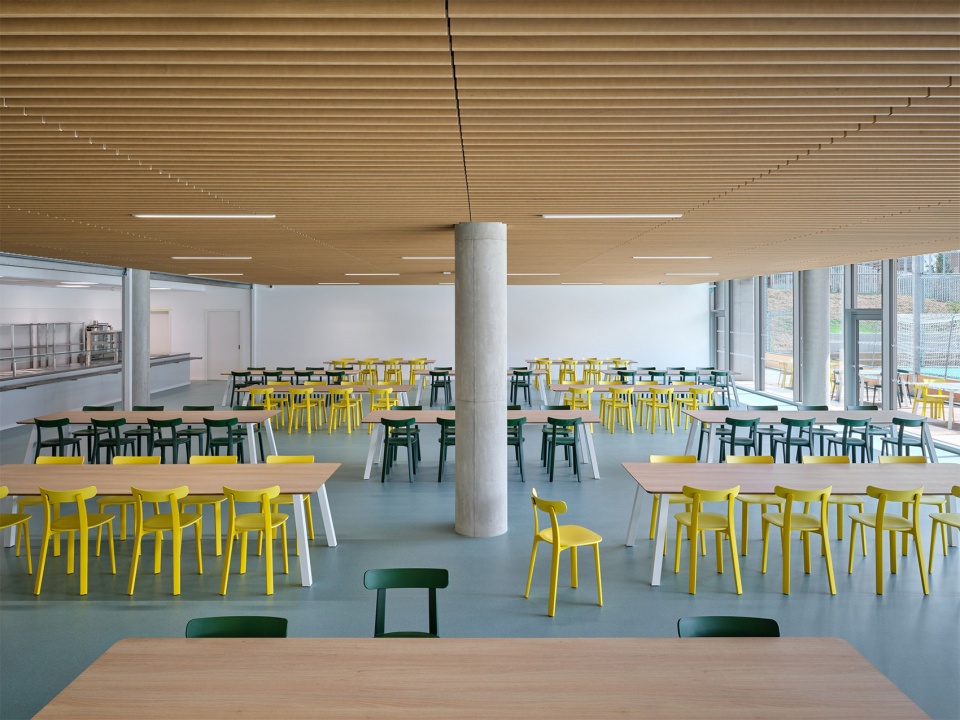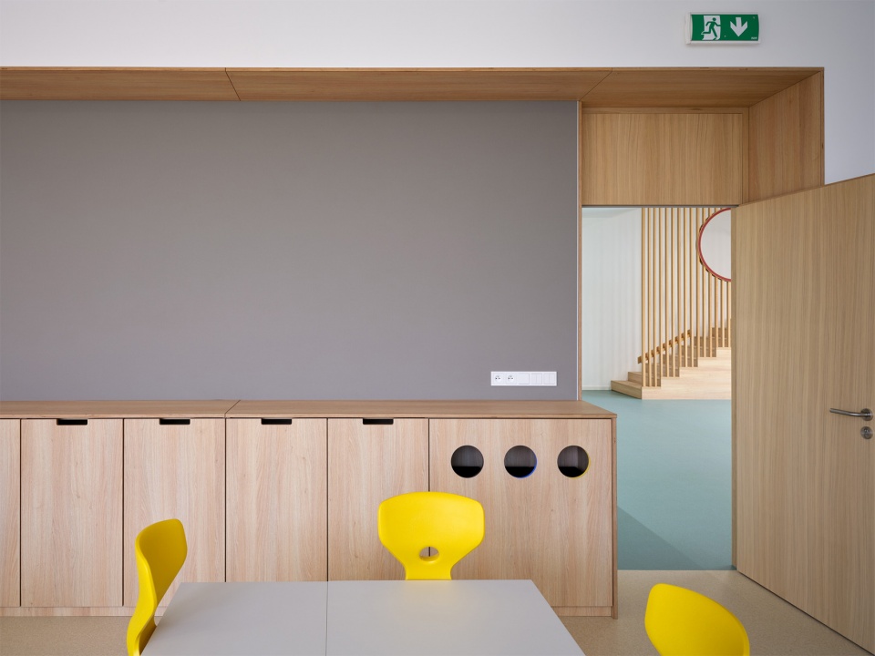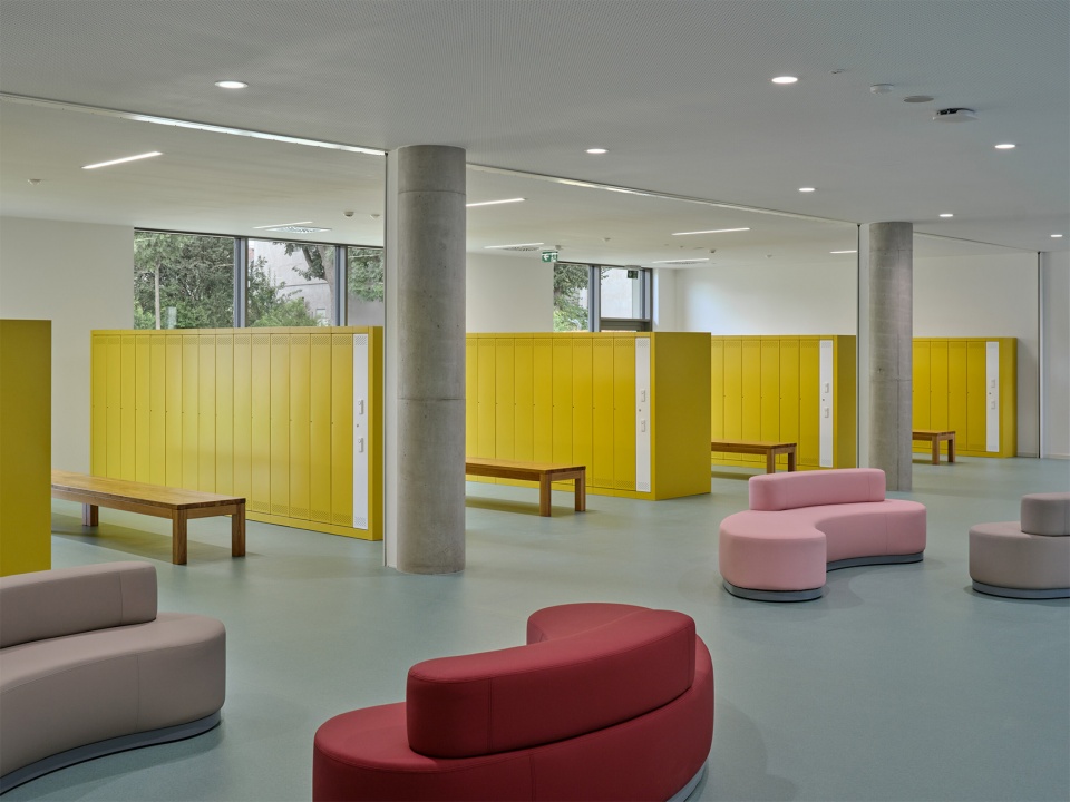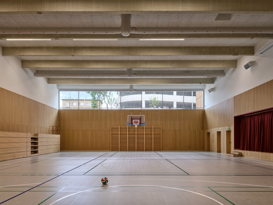 建筑内部以精心挑选的材料来强调代表性特征。该项目主要使用木材与水磨石地面并特别关注走廊的使用体验,宽敞的空间内布置了多种类型的座椅,并能透过玻璃窗看到教室内的活动。走廊不仅是儿童相遇、玩耍与自主学习的场所,也成为开展多样学习与课外活动的延伸空间。小学的教室与实验室均为灵活、开阔的空间,配备多样座位布置与现代化教学设备。