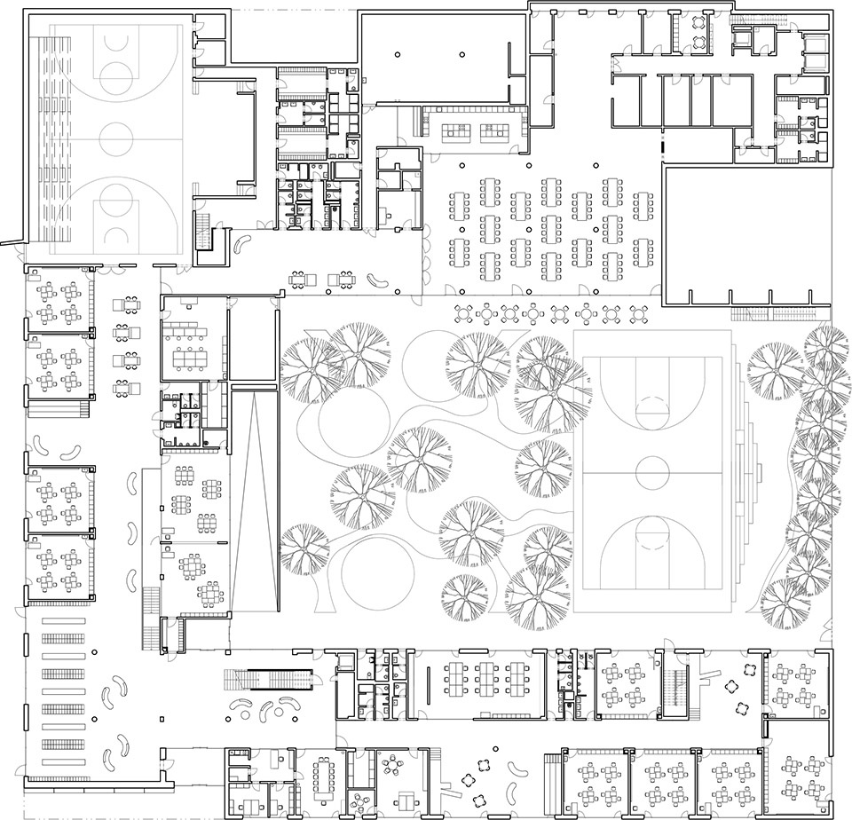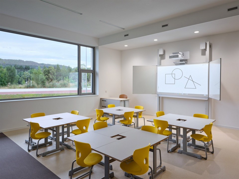 The entrance to the elementary school leads into the main hall, which features a central staircase, an administrative block, and changing rooms. Along the corridors running both north and south are the classrooms for the lower grades, as well as shared spaces for alternative learning, relaxation, and play. The upper grades are located in the southern wing on the second floor and are accessible via the central staircase. The corridor in the southern wing is expanded with bays intended for alternative learning. Beneath the covered grandstand on the third floor are an outdoor classroom, a service courtyard, and access to the roof terrace.