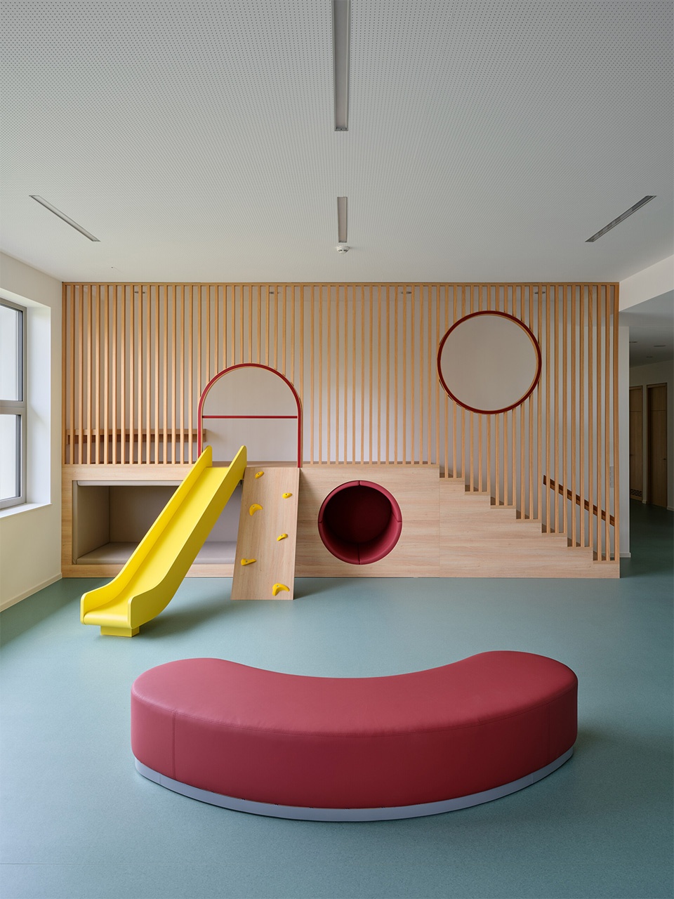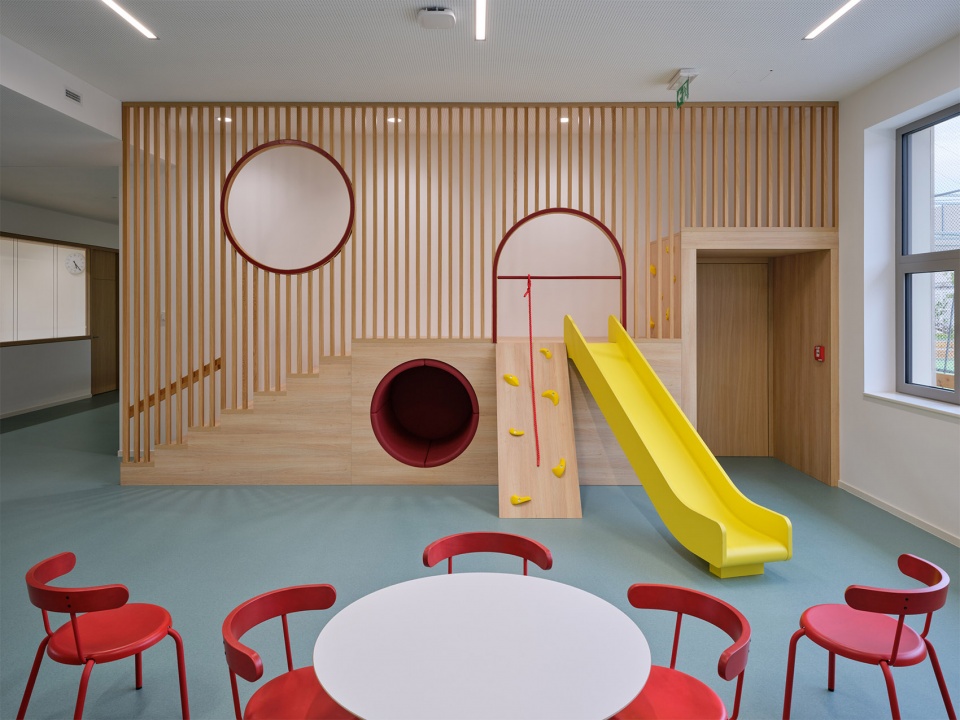 北翼包括多功能大厅、配套餐厅及为全校服务的运营与技术空间,其上层为幼儿园专属区域。幼儿园设有独立出入口,旨在确保幼童安全出入。建筑内部包含教室、活动区以及一处兼具教学与游戏功能的屋顶露台。大窗与天窗引入充足自然光,同时保持与校园庭院及绿化的视觉连通,使幼儿园自然融入整个校园环境。