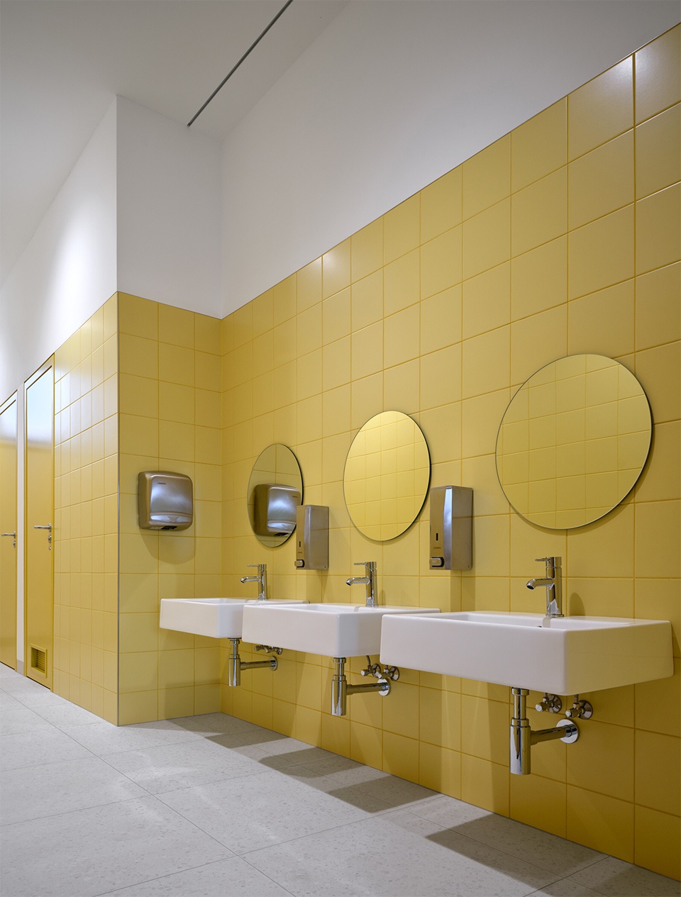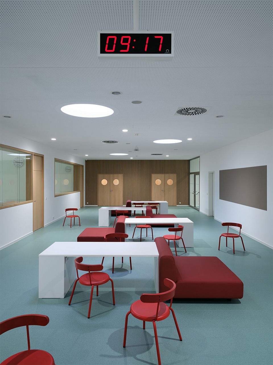 The interior of the building emphasizes its representative character, reflected in the choice of materials, particularly wood and terrazzo flooring. Special attention is given to the unique life of the corridors, which offer generous spaces with various seating types and views into the classrooms. The corridors are designed for children to meet, play, and study independently; they also provide opportunities for alternative learning or extracurricular activities outside the main classrooms. The elementary school classrooms and laboratories are flexible, spacious rooms with various seating layouts and modern equipment.