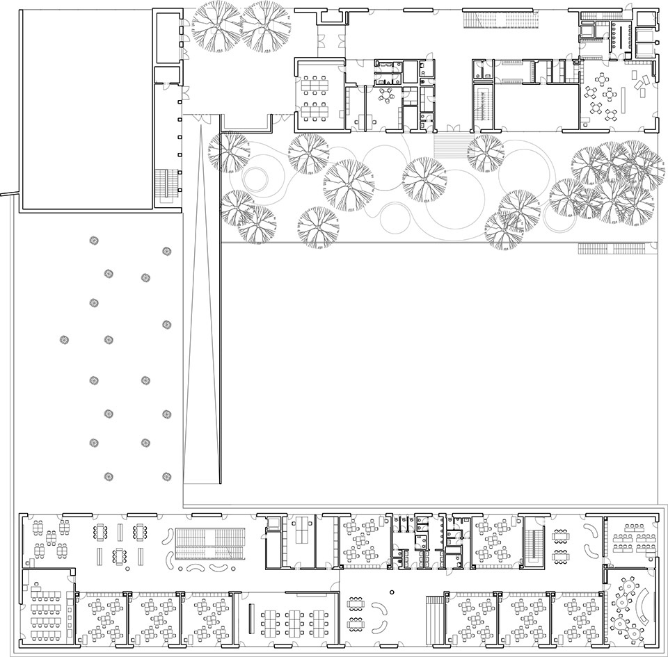 校园整体呈“U”形布局,由三层建筑围绕中央庭院展开。建筑巧妙地利用地形高差,使其在视觉上仿佛仅有两层。