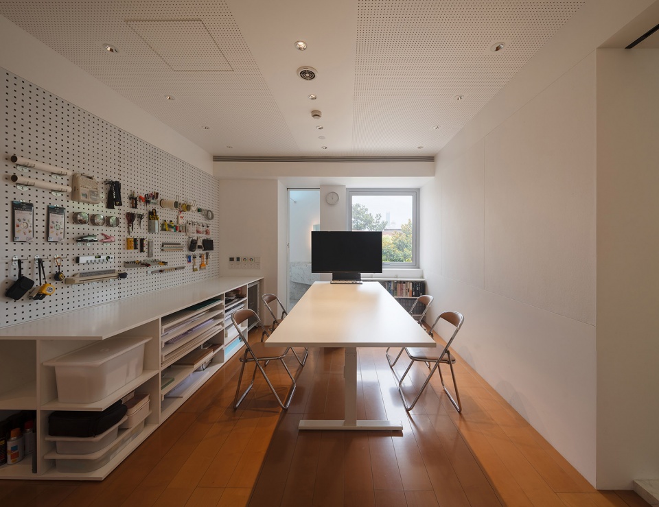 办公室功能以家具的方式被“后知”地置入空间。对已有的长桌、储物柜、模型桌、置物架等组合安排使单一空间功能模糊而可变。建筑秩序被作为高于平面合理性的规则对待,与城市关联的感受通过建筑形式获得。项目中包括材料和家具在内的可持续设计,是环中商厦办公室的延续;与街道和社区的连结让人想到康晖里那条“室内的茶陵路”;住宅和公共在X和Y轴上的体现像是对棠之酒店的呼应,而它现在就在这里,在繁茂的树荫与热闹的人群中,在襄阳南路。