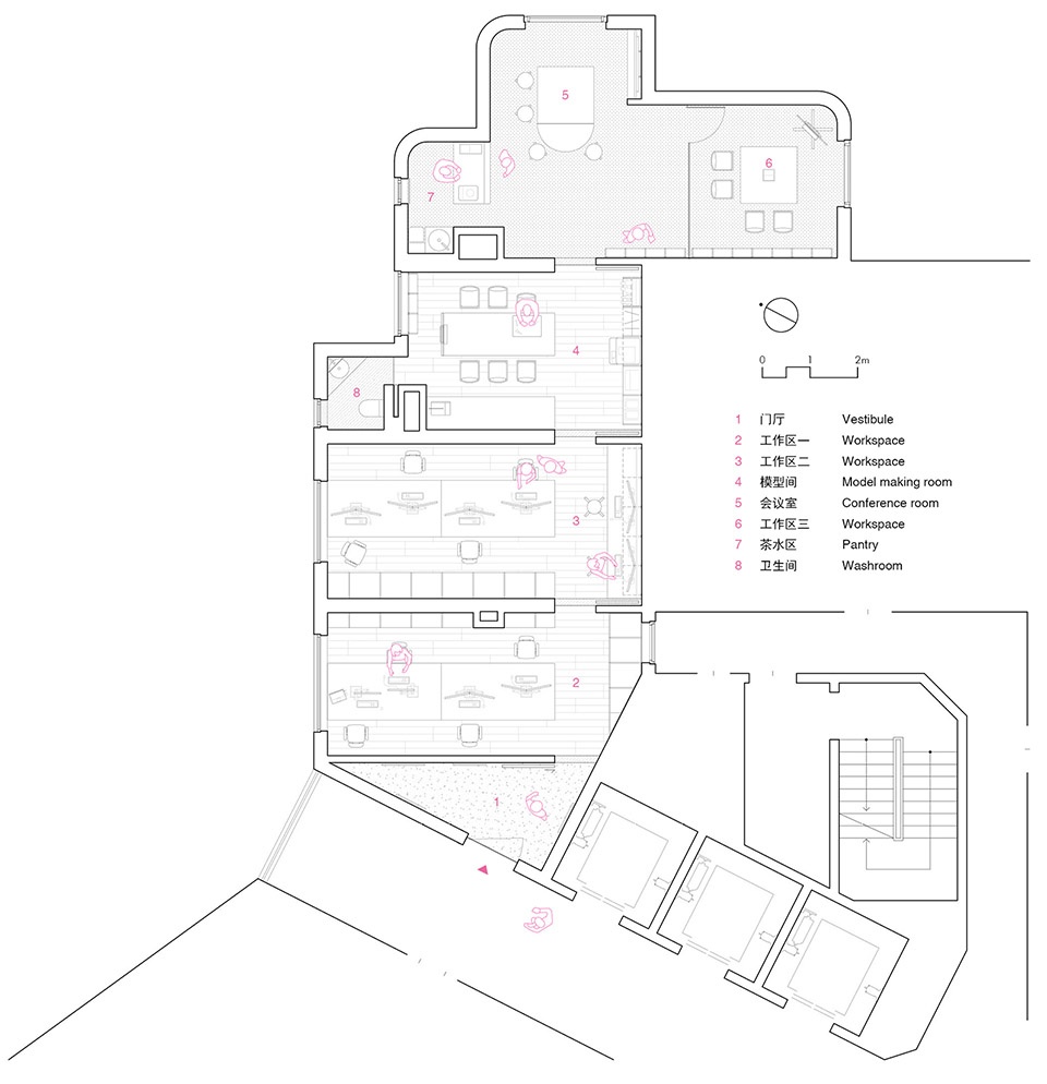 从空间入手到功能后置是这次设计思路与以往的不同。寻找在一定距离保持与人群的接触和链接的方式,对完成“街道-大厦-工作室-街道”过程需要经历多少个空间的梳理,是设计的出发点。在大厦中增加小三角空间,用错位方式进入并穿越“住宅”,到达“客厅”空间进而望向襄阳南路,这个过程中空间是安定的,人的感受经历变化并重新定义与街道的关系。工作室的四级台阶串联起大厦的微社区环境和人来人往的城市街道。