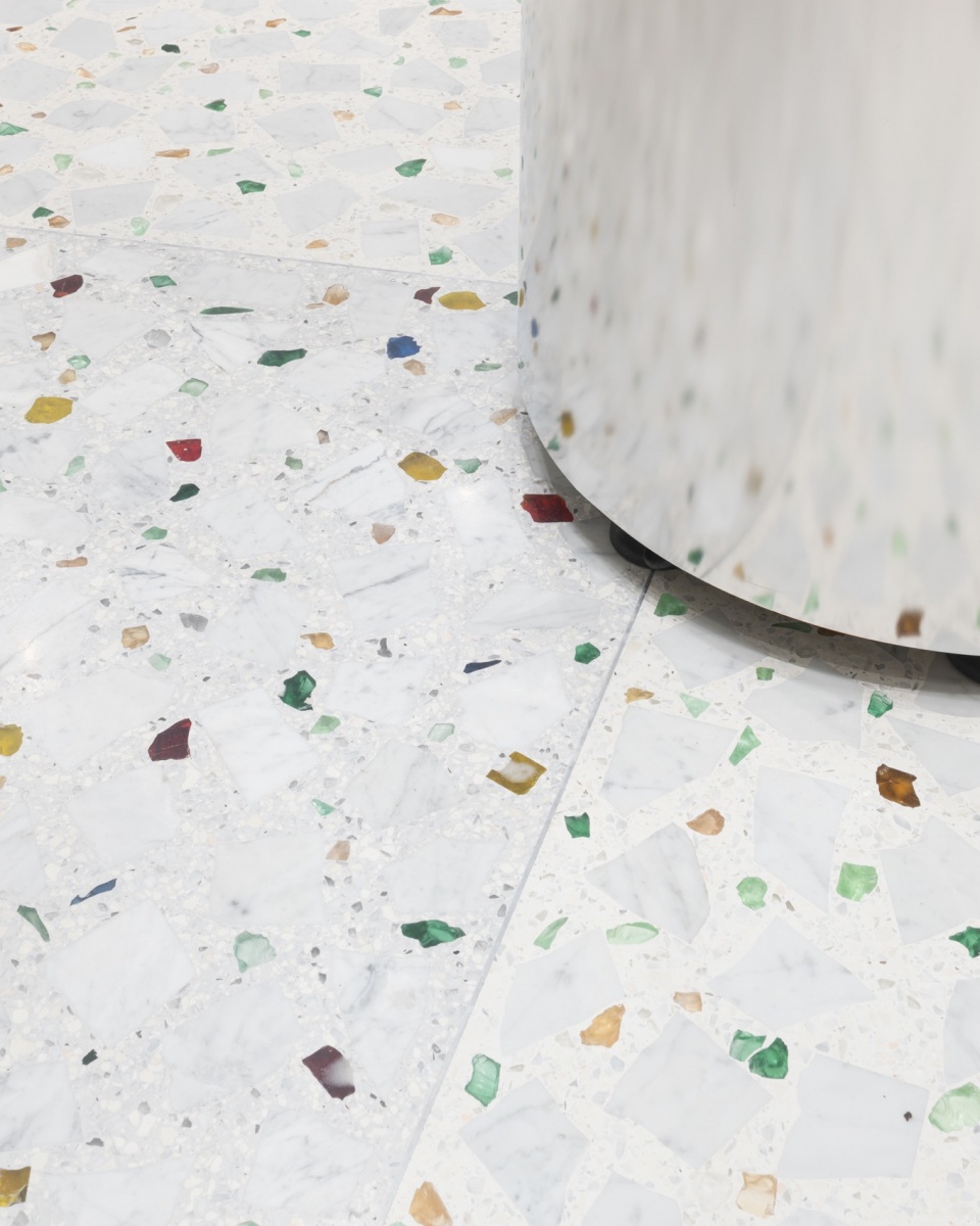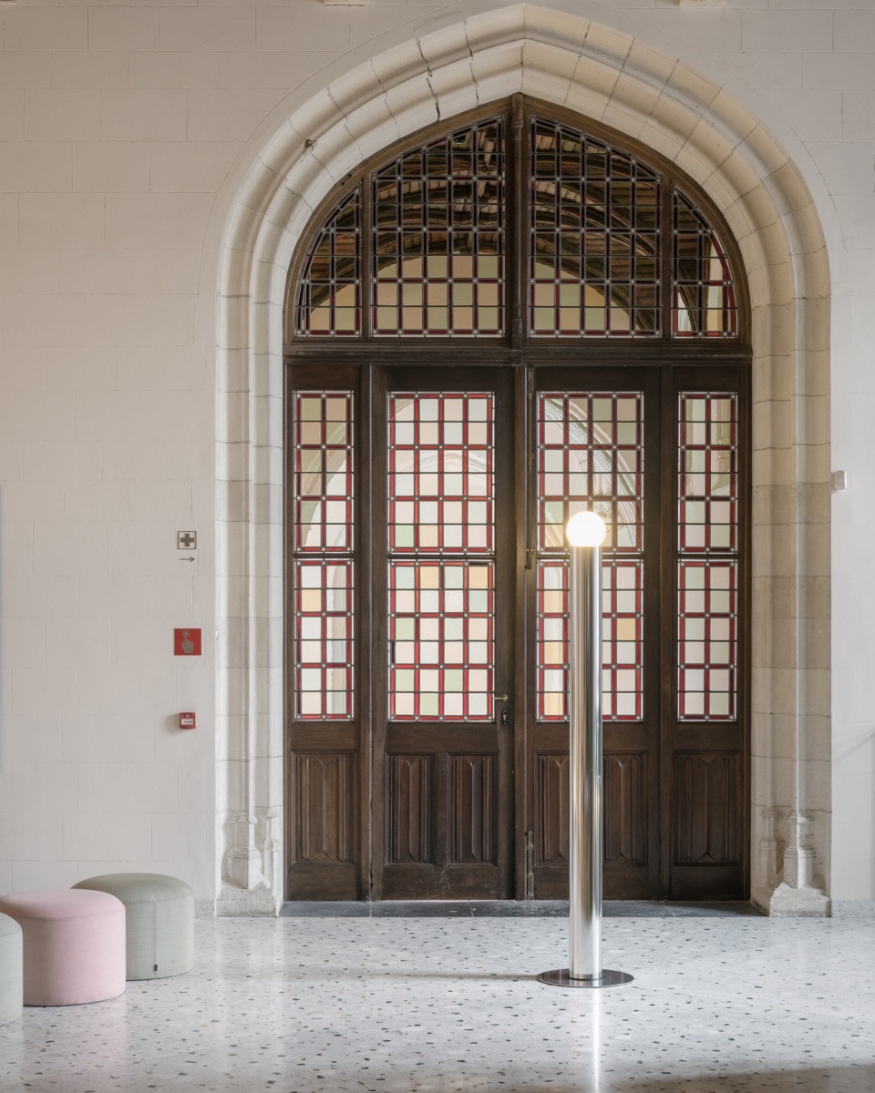 Every aspect of the renovation was carefully planned, respecting the building’s character while anticipating future uses. Improving accessibility and comfort was a major focus given the complexity of the structure. The large hall now acts as the heart of the building, directing visitors to the various parts of the center and exhibition spaces. The non-original natural stone floor from the 1990s was replaced with a new terrazzo floor featuring an oversized checkered pattern, subtly referencing the original articulation of separate rooms while creating a unified forum. A metal grid embedded in the floor integrates state-of-the-art technical solutions, offering plug-and-play nodes for flexible event setups.