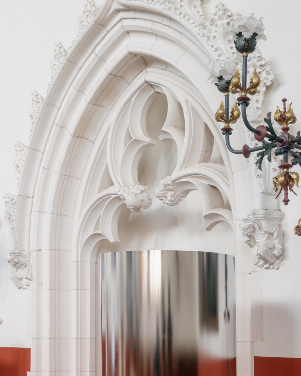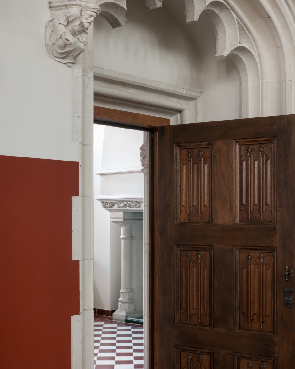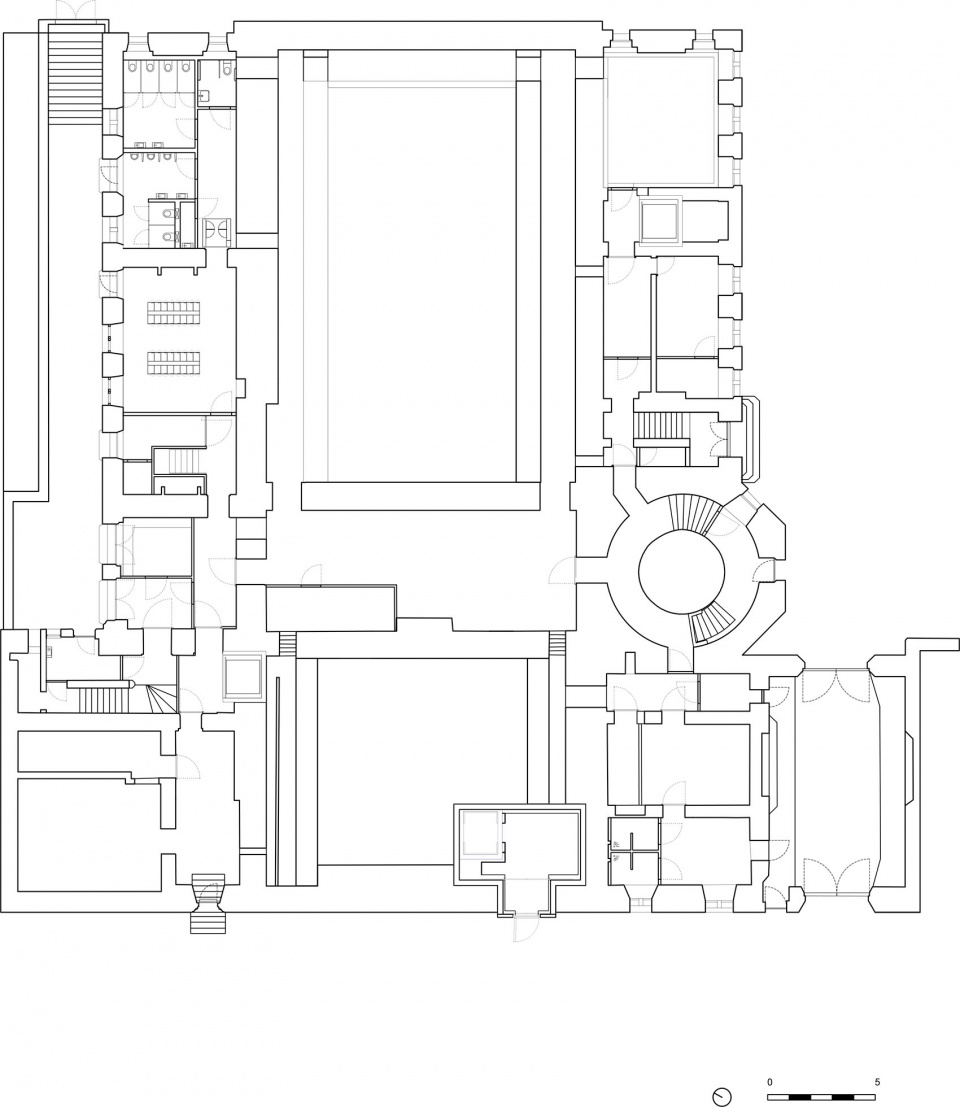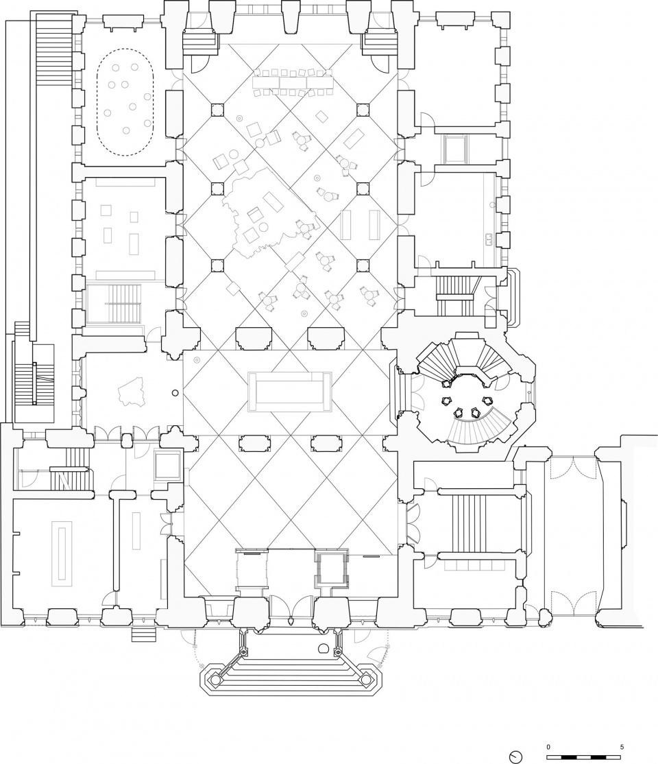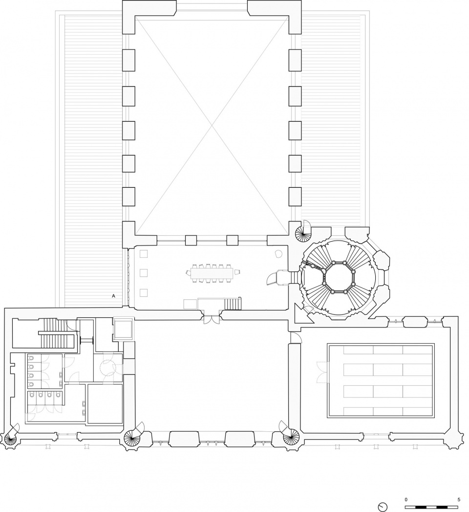 The forum is flanked by supporting functions organized in the side wings. In the south wing, a new elevator, carefully inserted within the historic structure, creates a much-needed logistic link, greatly facilitating the movement of staff and catering services to the authentic interiors on the upper floors. In the north wing, a new stairway connects the forum to new lavatories and cloakroom facilities.