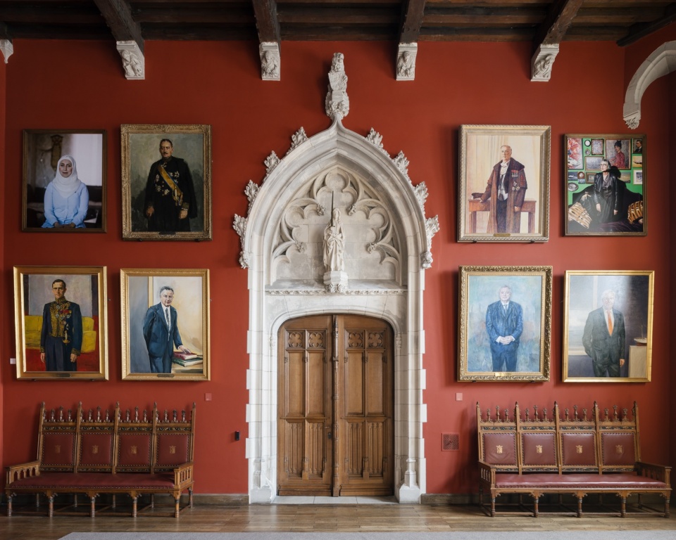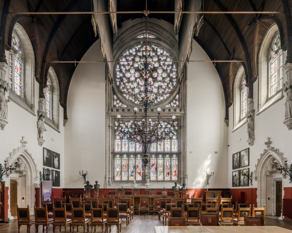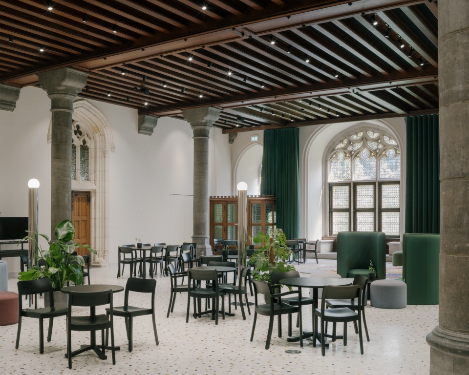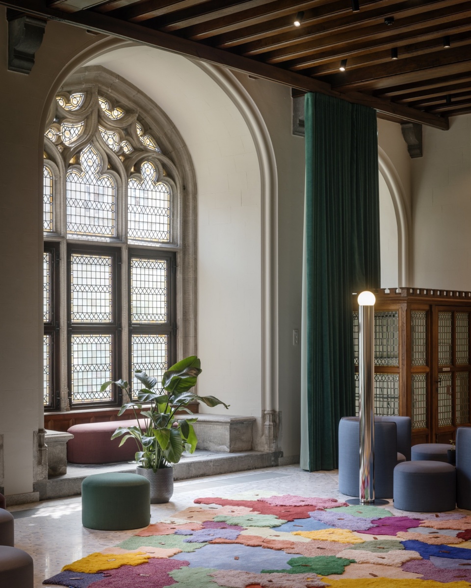 On the first floor, the historic rooms provide a grand setting for conference and meeting facilities. These interiors were stripped of low-quality interventions and updated to meet contemporary standards of comfort and functionality, while preserving their historic character.