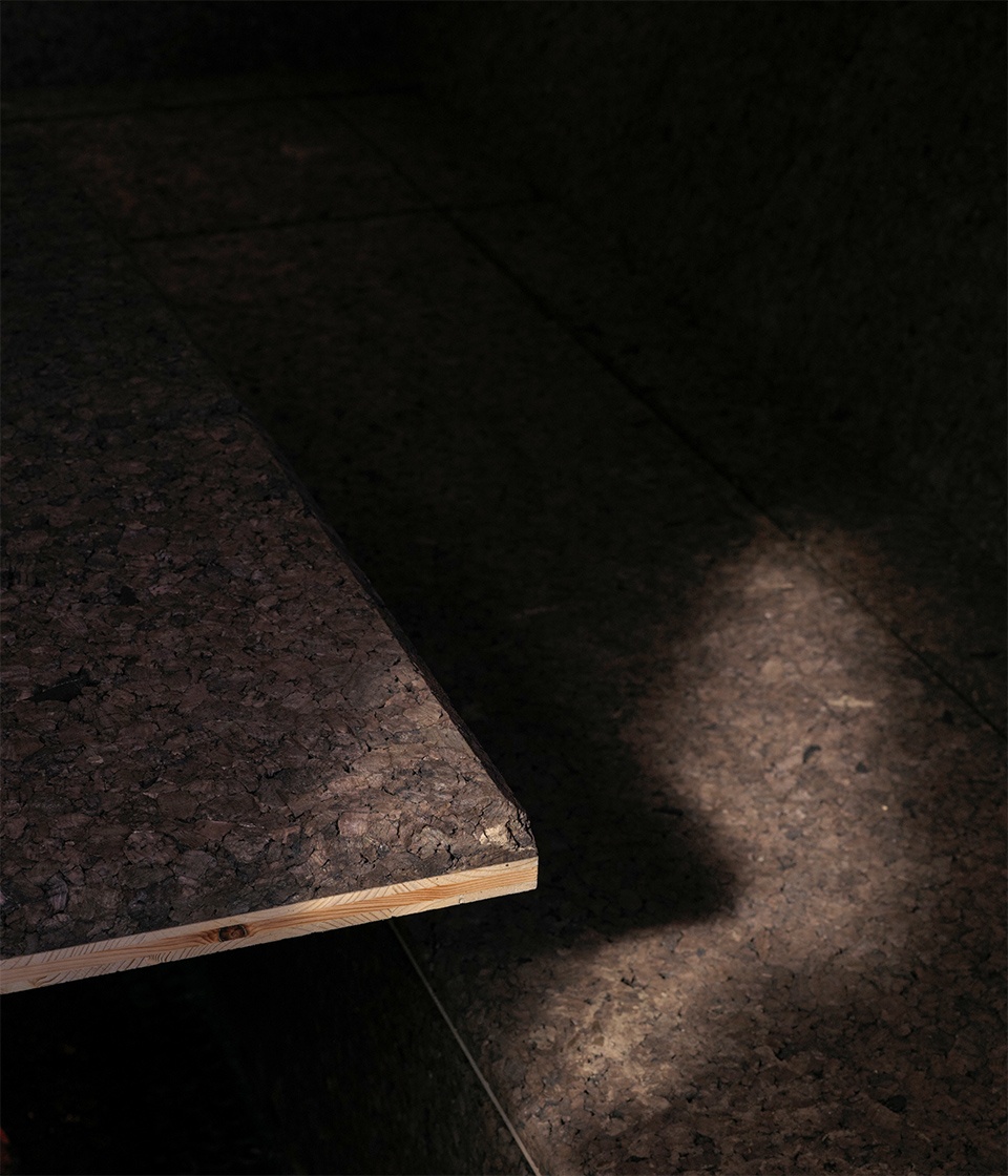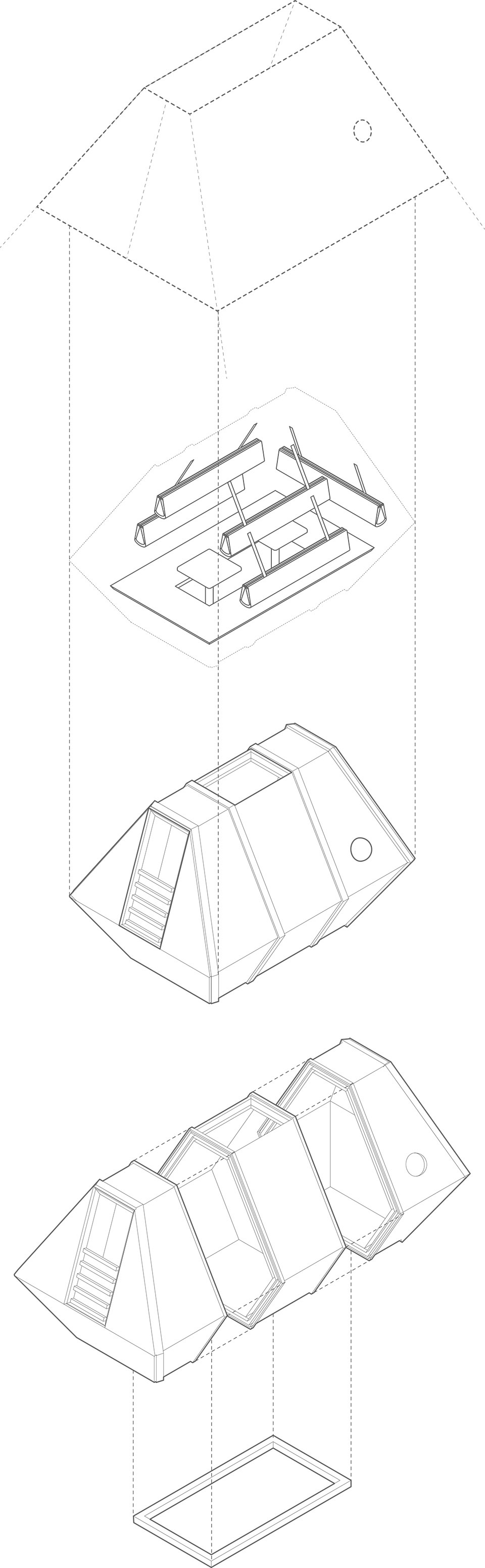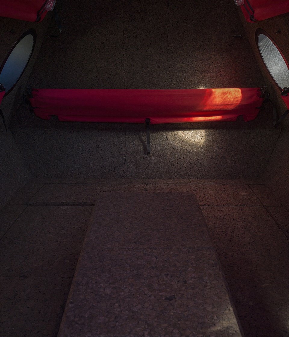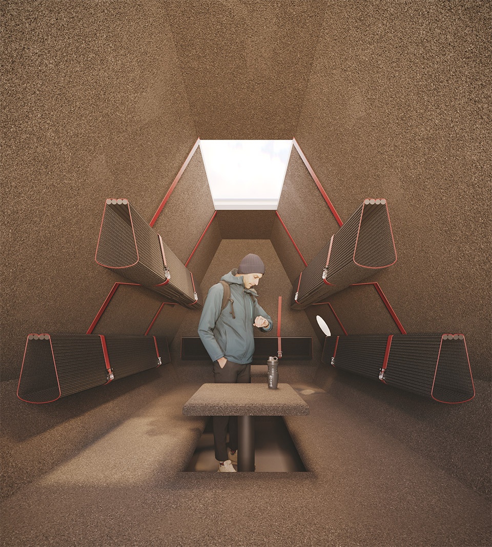 庇护所可容纳9人,设有环形长凳与可折叠床铺。其灵感来自登山用的悬挂睡台,并可在紧急情况下转化为担架。这展现了它既是避难所又是生存工具的双重身份:一座人类在极端环境中的“驿站”。内部由顶部采光,呈现丰富的感官体验:软木的气味、被包裹的静谧,以及天窗与舷窗间滤入的光线,共同营造出一种悬浮、几近冥想的氛围。