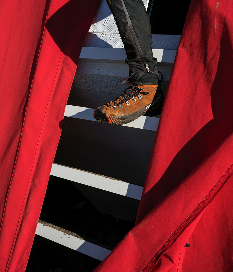 The new bivouac represents the first permanent emergency textile structures in an alpine environment : an experimental prototype combining sustainability, rapid assembly, and spatial efficiency. The construction system, developed specifically for this project, allows installation in extreme contexts thanks to a total weight of just 2,500 kg and a minimal footprint of approximately 2.5 square meters . Its compact size (3.75 x 2.60 x 2.60 m) and tapered shape reflect a design approach focused on functionality and low environmental impact. The interior is lined with natural cork , providing both thermal and acoustic insulation and creating a warm, immersive atmosphere.