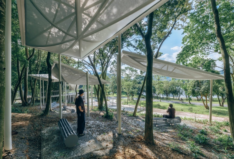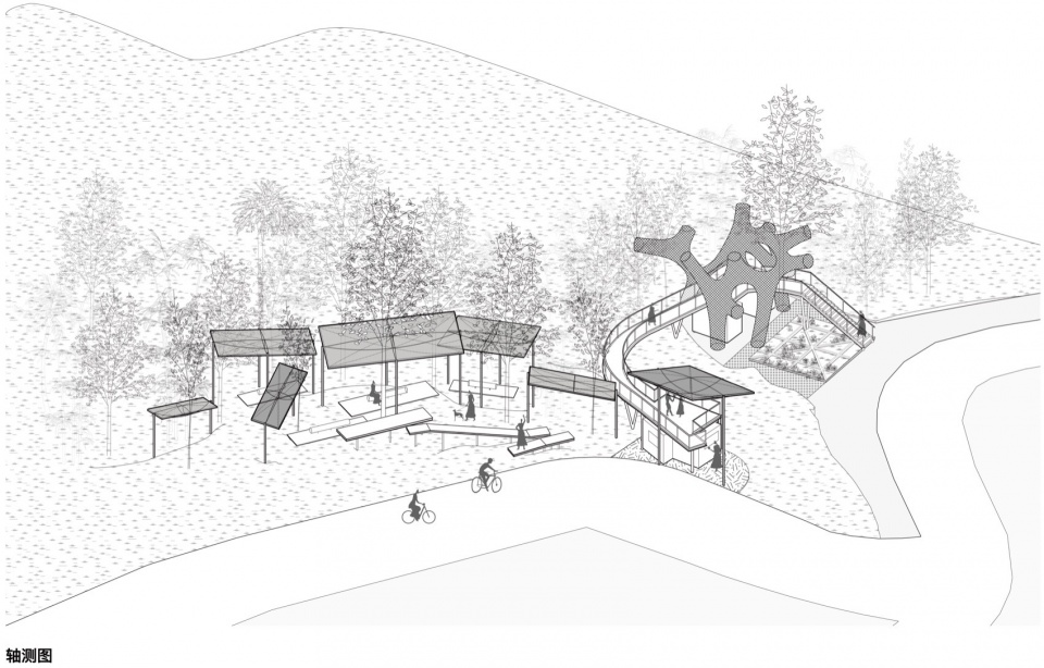 7片半透PTFE/法拉利膜顶模拟自然树林的形态,成为骑行者休憩的场所。它们如同人工的“树冠层”,在真实的树林中生长出来,茂密、交织、穿透、轻盈,形成第二层“人造林冠”,与原生树林产生视觉和空间上的互动。