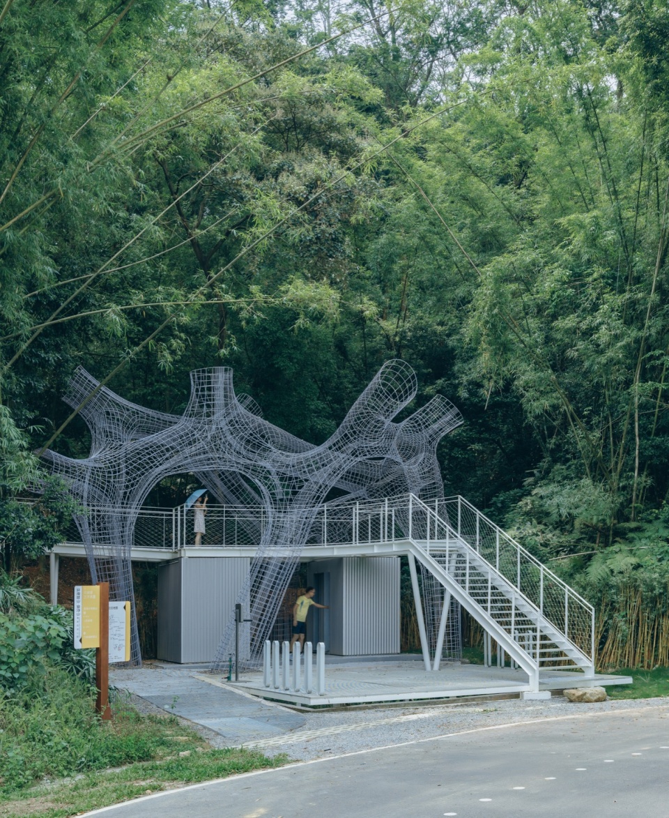 Above the restrooms, artist Xu Ziwei’s installation Lightwoven Forest responds to the canopy structure. Composed of woven materials that interact with shifting light, the piece transforms the space into an unexpectedly poetic and atmospheric zone, blurring the boundary between functional infrastructure and public art.