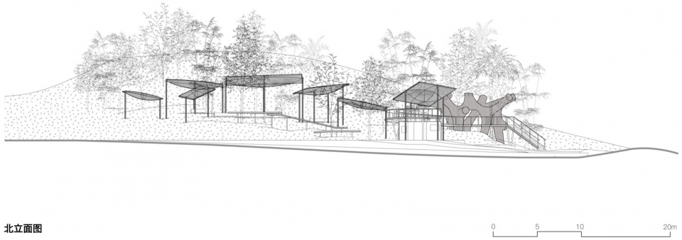 其中咖啡屋由众建筑的长期产品”插件家”构建,卫生间由一体化卫浴产品形成,两者都快速搭建,同时成为炎热华南地区中高性能的房屋,实践了对自然轻质介入的态度。这处人造与自然相融的场所,既提供了实用的庇护和服务,又创造了宁静、放松、与自然和艺术对话的瞬间。“穿透、轻盈、交织”这些关键词不仅是对膜结构的描述,更成为了整个空间氛围的基调,定义了使用者的感受。