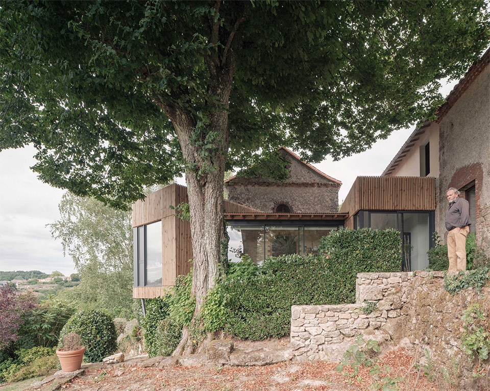 本项目位于法国Mortagne-sur-Sèvre,坐落于圣马丁庄园住宅区与历史村落中心之间。设计团队从场地的历史语境出发,细致回应了其独特的文脉特征。基地内保留着多栋不同时期的旧建筑,其中最具代表性的是一座石砌小礼拜堂。新建筑以克制而有节奏的空间序列环绕古迹展开,通过玻璃与木材的串联,将花园、露台与室内空间有机连接。