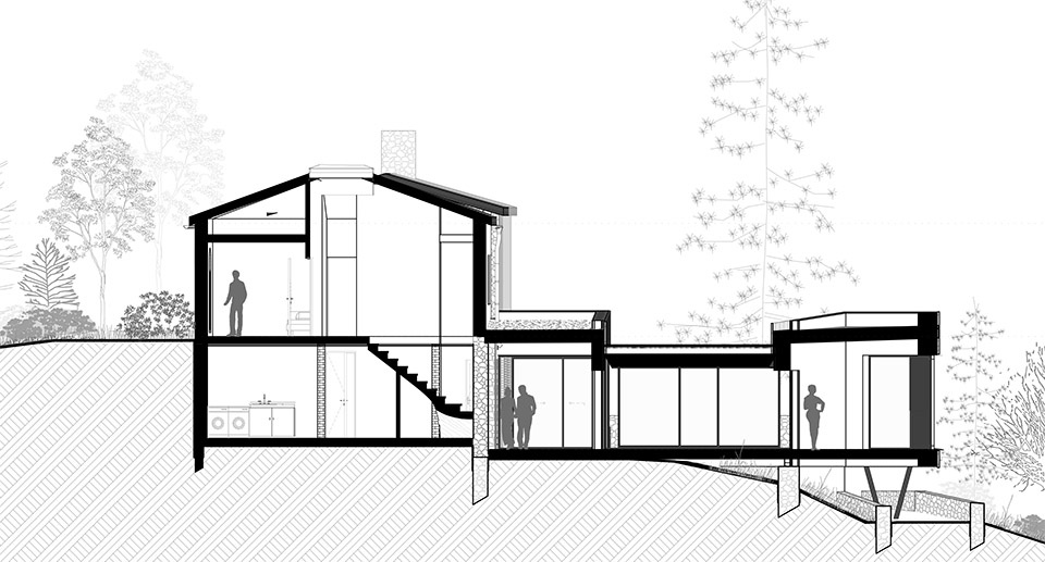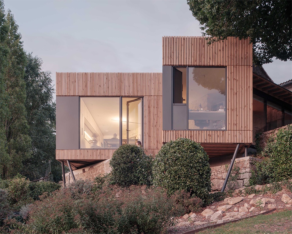 The extension sits on a wooden frame and stilts, riding the land’s fall rather than cutting it flat. Like treehouses, three fragmented suspended volumes, each with a dedicated function, touch lightly and keep ground flow beneath them, offering a striking contrast with the solid masses of the historic buildings.