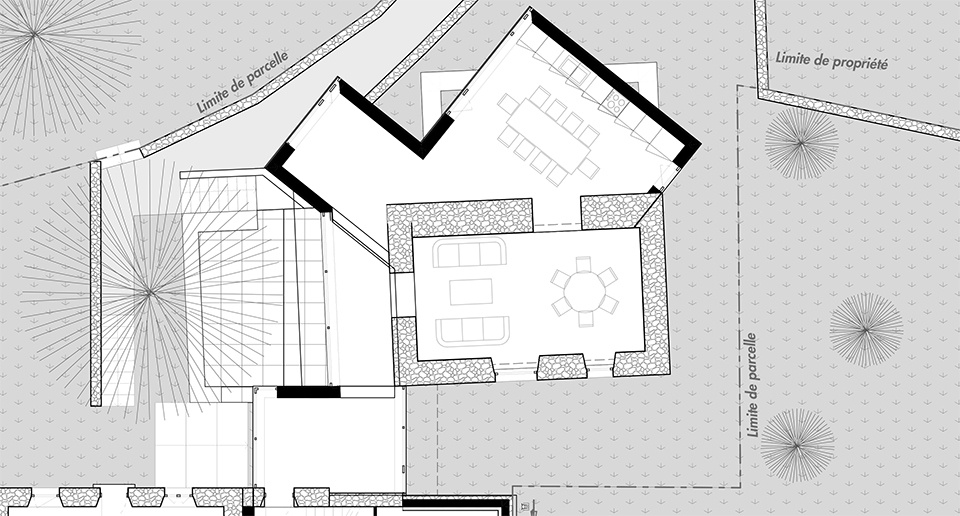 On stilts, the new volumes ride the slope and open toward the wooded hillside and the Sèvre Nantaise river below. Each step calibrates relation : old to new, inside to garden, near to distant view. First, the reception vestibule—with glazed panels on both sides—opens transparently toward the garden. Beyond, a glazed gallery connects directly to the outdoor terrace, leading to the office space, which enjoys unique panoramic views. The sequence culminates in a spacious dining area, featuring its own independent entrance.