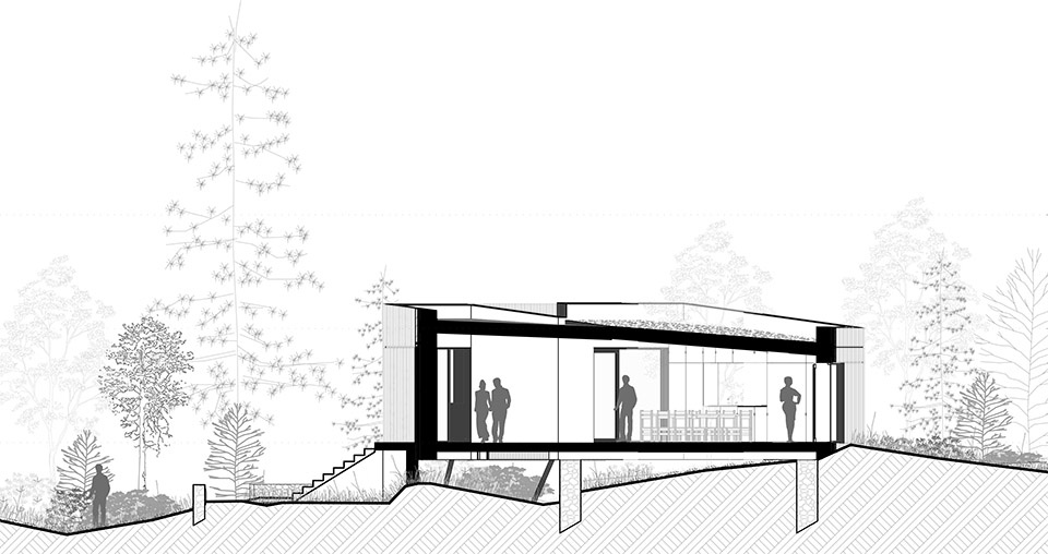 建筑以支柱架空于坡地之上,顺势延伸并面向林木掩映的山坡与下方的塞夫尔南泰兹河谷。空间动线的每一步都精确地平衡了新旧、内外、远近的关系:从通透的接待前厅,到通往露台的玻璃廊道,再到拥有全景视野的办公区,最后在设有独立出入口的宽敞餐厅中抵达终点。
