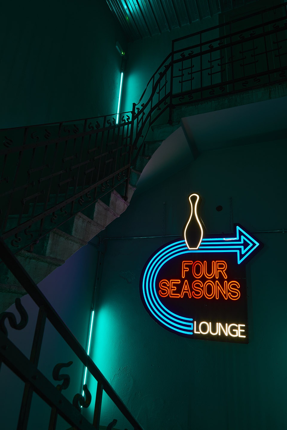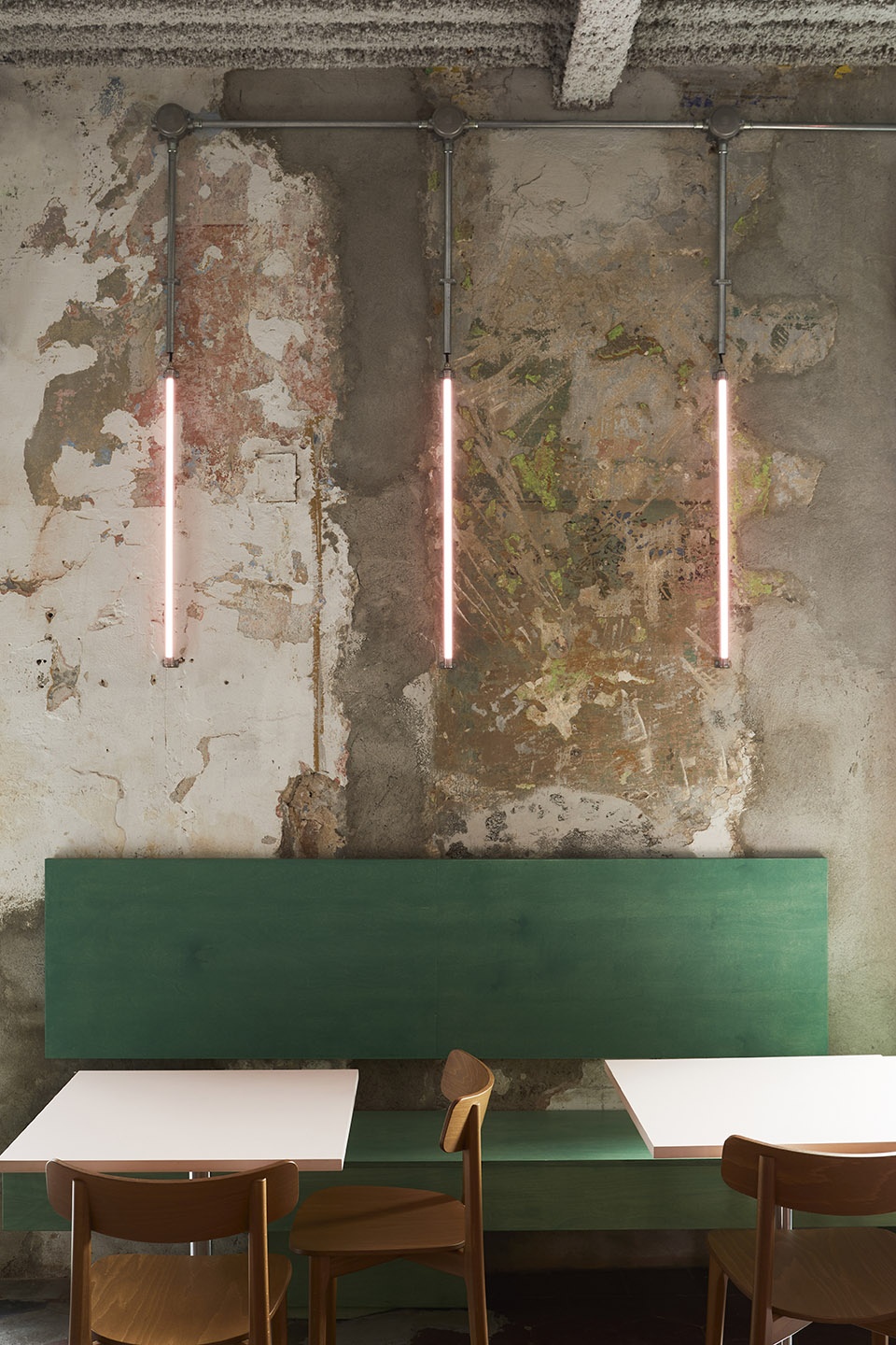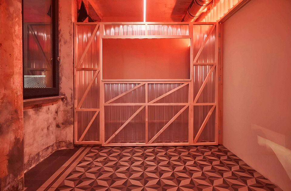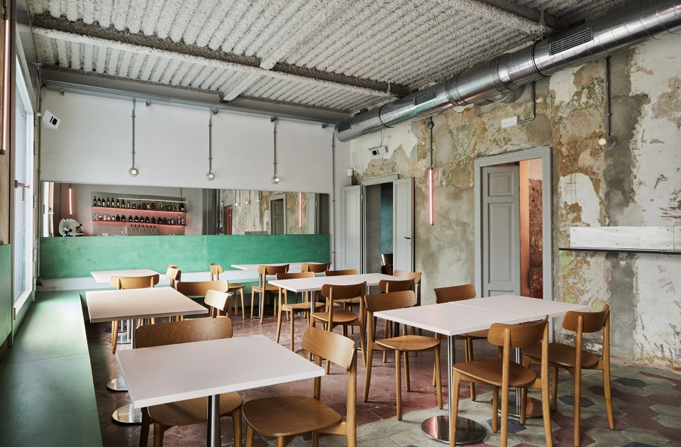 原有的建筑材料,诸如水泥地砖、灰泥、历史字迹等都被悉心修复。而建筑的设备系统则刻意外露,如金属脉络般穿梭于墙体与天花之间,营造出一种介于工业风、达达主义与赛博朋克之间的视觉氛围。设计意象不难追溯至Terry Gilliam的《巴西》、日本动画《Akira》以及多种复古未来主义的反乌托邦想象。