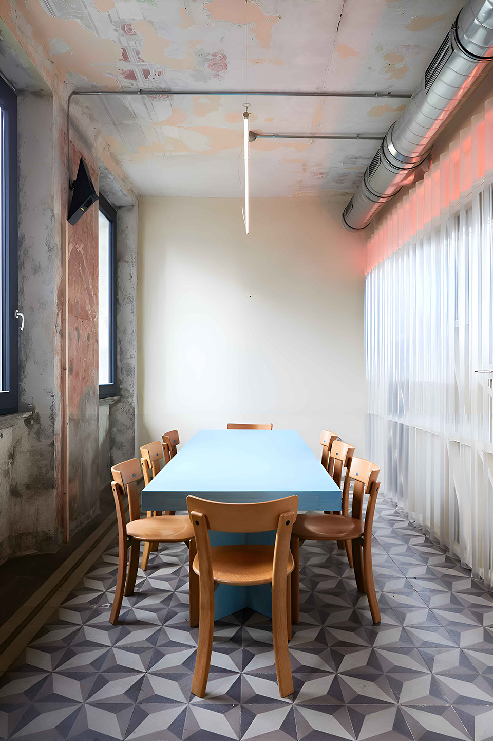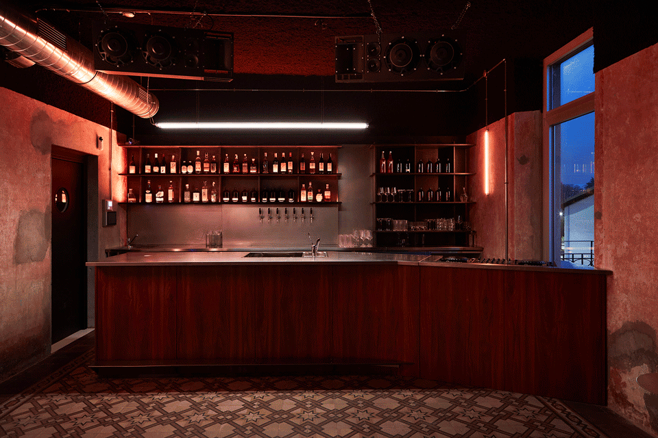 The original materials – cement tiles, stuccoes, period lettering – were carefully restored. Yet the building systems, deliberately left exposed, cut across ceilings and walls like metallic veins, evoking an industrial, Dadaist, cyberpunk aesthetic. Unsurprisingly, the references range from Terry Gilliam’s Brazil to Akira to retro-futuristic dystopias and visionary imaginaries.
