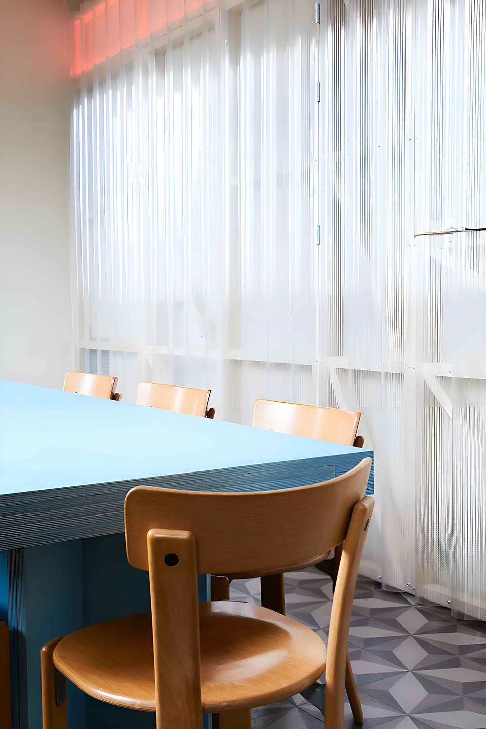 两处介入重新定义了立面:一是面向街道的大型橱窗,既将城市景象引入室内,又承载了俱乐部的霓虹招牌;二是由钢与穿孔金属板构成的外部楼梯,连接两层大厅并延伸至露台,使建筑的垂直流线也成为音乐体验的一部分。