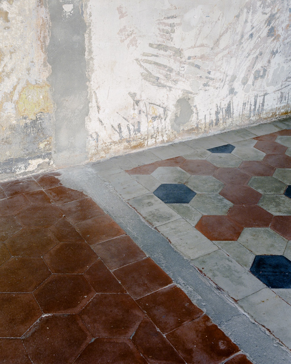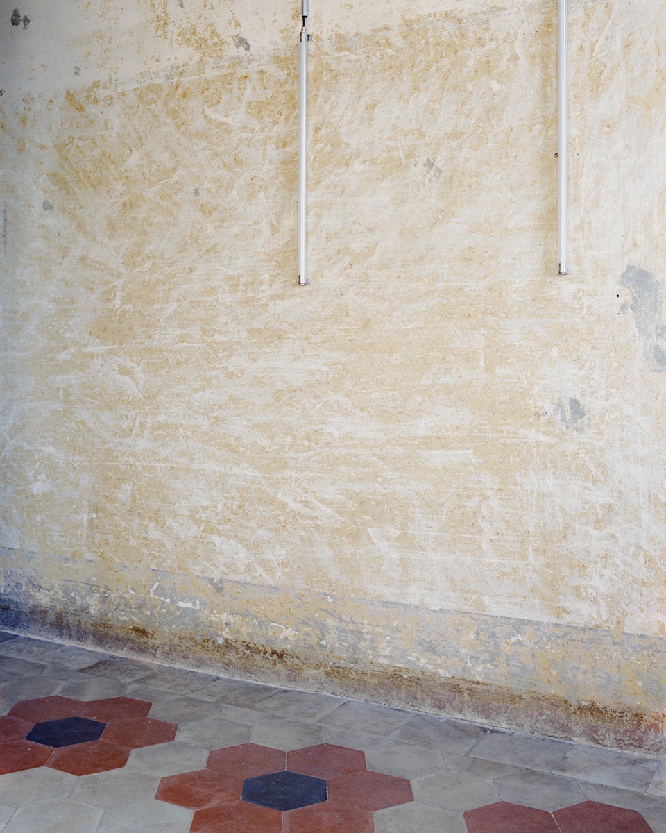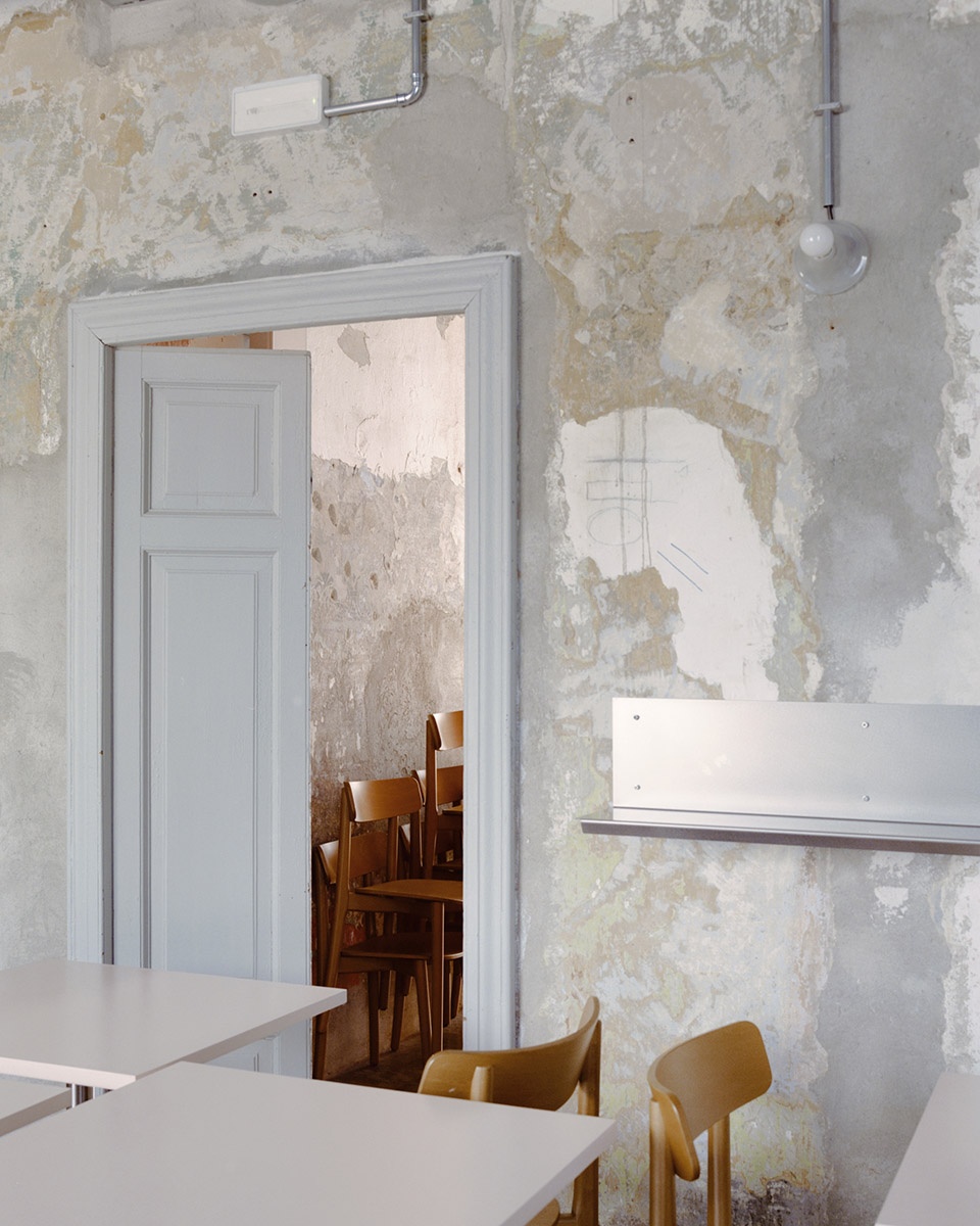 The building envelope follows the same logic: the villa was “stripped back,” freed from accumulated layers to reveal cornices, decorative frames, and the historic inscription SUINI DA MACELLO (“pigs for slaughter”), a memory etched into the architecture itself. An ironic yet radical gesture that ties the new function to its past without erasing it.
