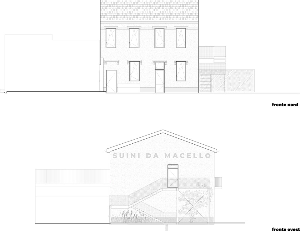 建筑外壳遵循相同的设计逻辑:别墅被“剥离”回原始形态,清除多余层叠后显露出檐口、装饰框架,以及刻在立面上的历史铭文SUINI DA MACELLO(意为“待宰猪”)。这是一次既讽刺又激进的设计动作——让新功能与旧记忆相互呼应,而非彼此取代。