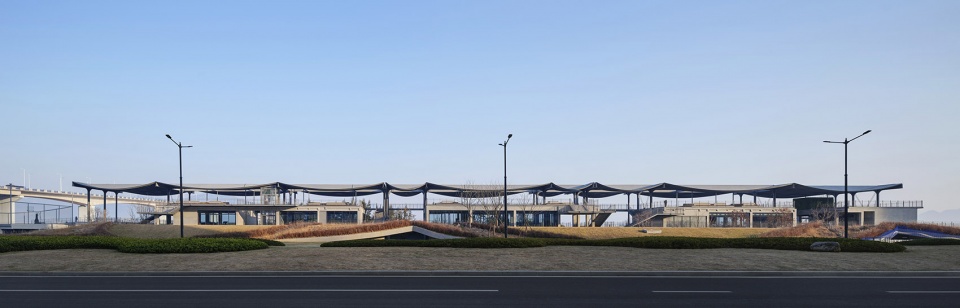 渔家,代表文脉的传承与演绎。连绵起伏的屋面是对江上晾晒渔网这一椒江日常场景的回应。建筑南侧绿坡取形渔梭,将车库入口和谐地融入其中。建筑北侧联系台阶和东侧球场围栏则呼应江面微波,与主体建筑融为一体,创造松弛轻快的场所氛围。