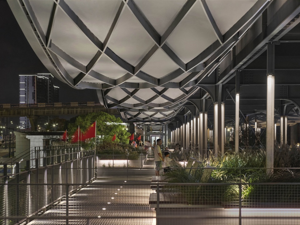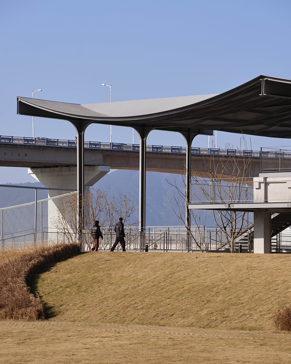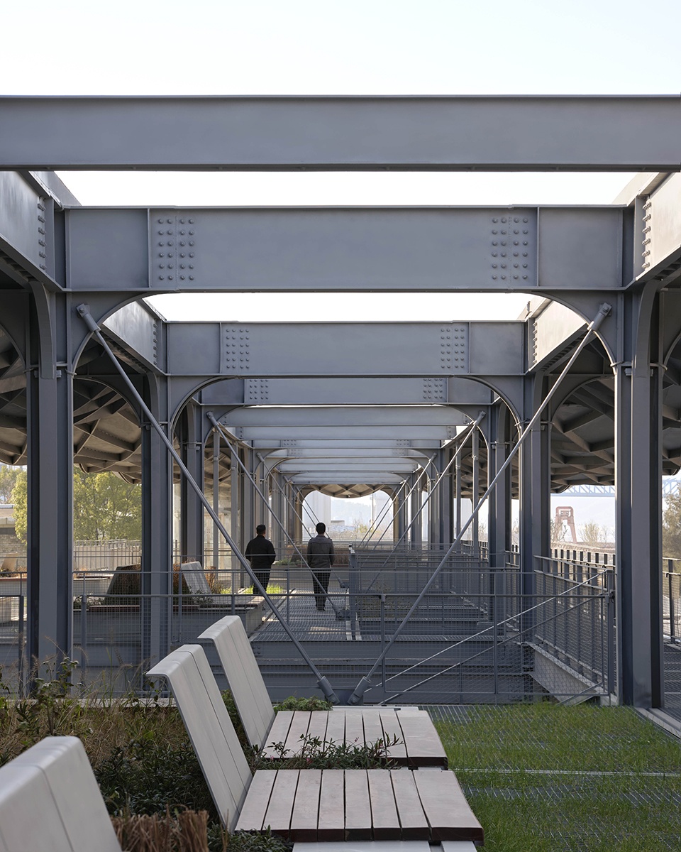The steel pavilion has been superimposed upon the preserved concrete framework and features newly added platforms and staircases with elevated steel grating. Grass has been planted in the spaces between the steel structure’s lightness and the concrete’s heaviness, adding a soft vitality that reflects the ecological transition from brown to green along the riverbank.