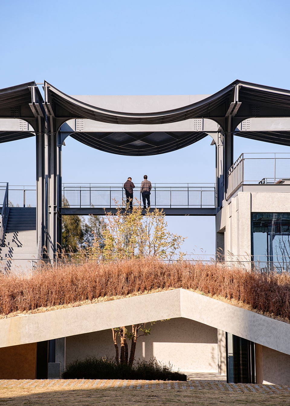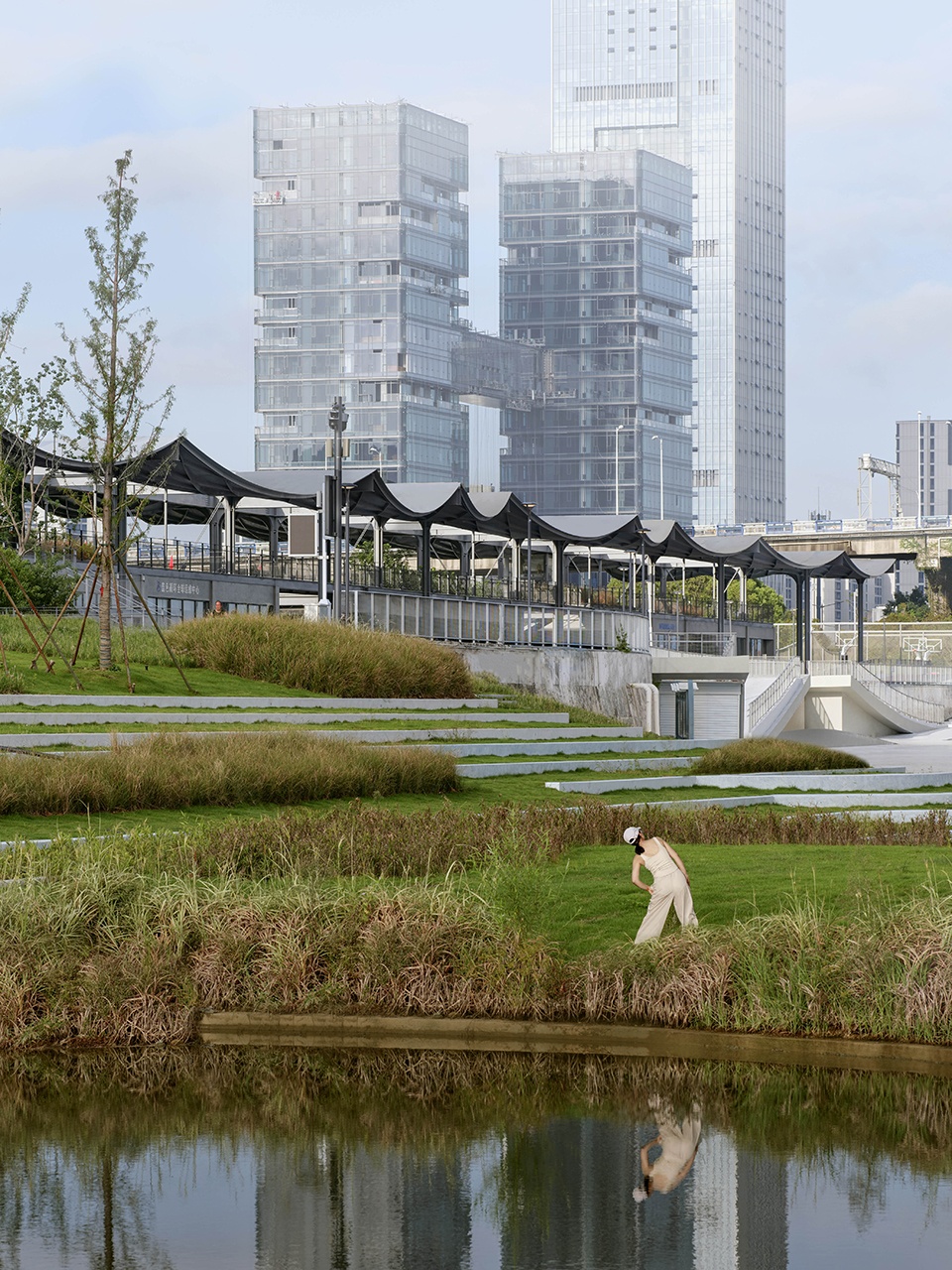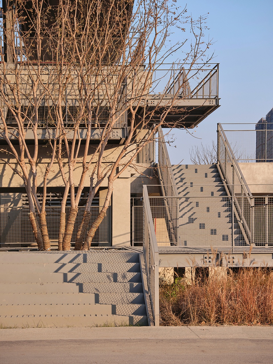 The steel pavilion has been superimposed upon the preserved concrete framework and features newly added platforms and staircases with elevated steel grating. Grass has been planted in the spaces between the steel structure’s lightness and the concrete’s heaviness, adding a soft vitality that reflects the ecological transition from brown to green along the riverbank.