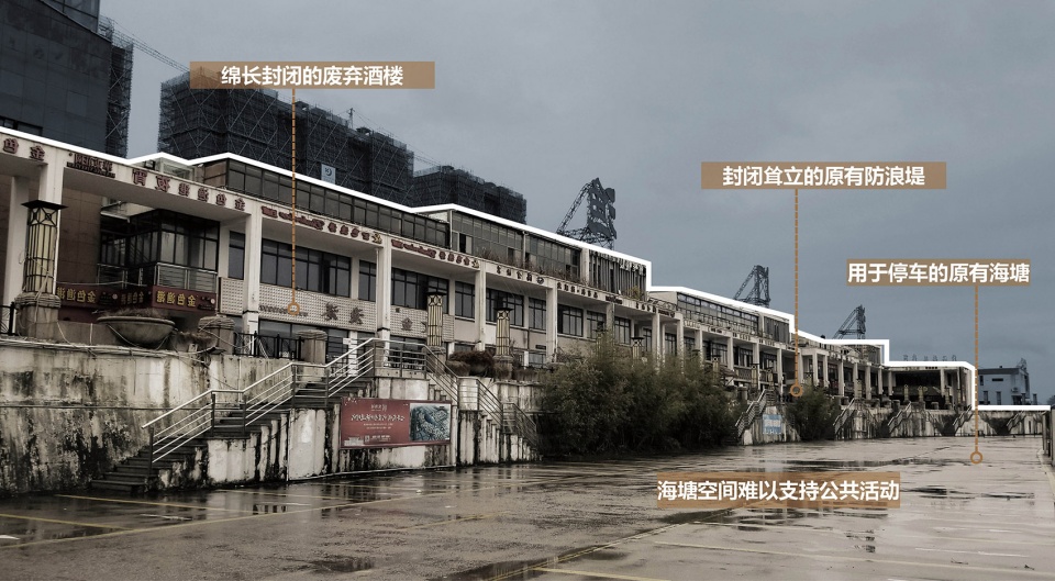 原有海塘空间封闭而绵长,防浪堤高耸孤立,堤顶空间狭窄,内外连续性低。堤上遗留两座弃用建筑,高4层,面宽达270米,严重阻碍城市与江岸连接。