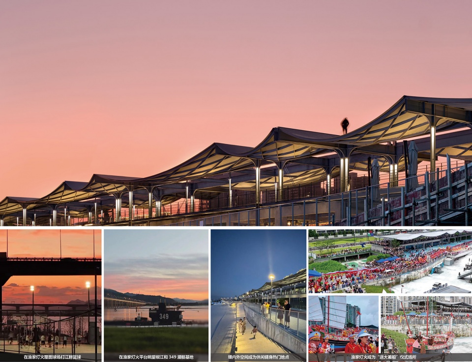 设计团队回访时,随暮色降临,渔家灯火的灯光逐渐亮起,人头攒动间,本地居民自发向游人介绍建筑形象和渔家文化的联系,生动地描述着“吹江风、吃海鲜、看江景、打篮球、跳广场舞”的动人场景之时,渔家灯火,已是日常。仿佛本就生长在那一样。
