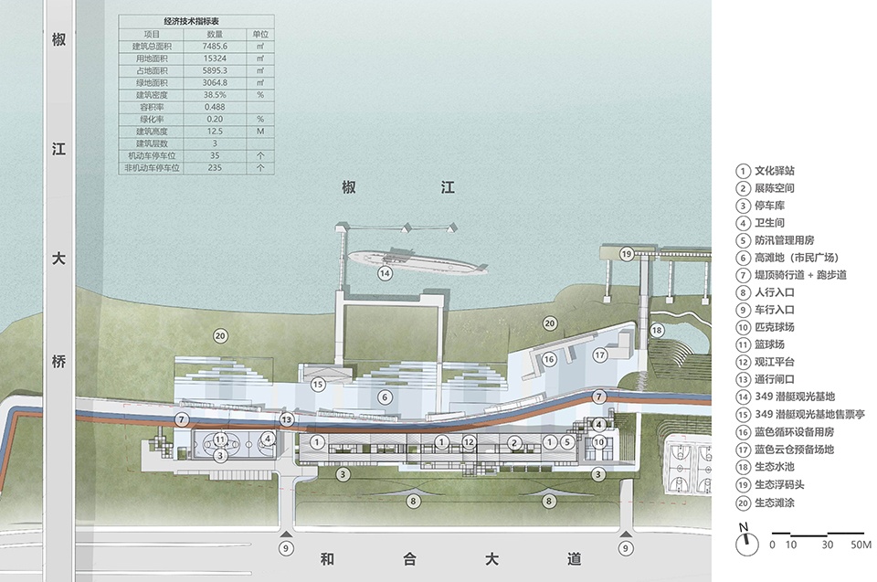 To maximize preservation of the existing structure’s historical and material value, the design incorporates partial retention by placing courtyards and platforms within it. By integrating it with the seawall, a riverside public space is created that combines infrastructure, public greenery, and community amenities.