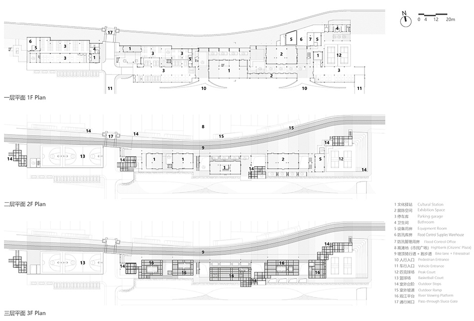 根据结构评估和江城链接视线分析,设计将原有的四层建筑水平削切至两层,并在垂直方向打通6条垂江通道,对剩余部分局部切割,形成7组的院落空间。合理组织室内空间用于容纳水利文化展览、市民驿站、运动空间、水利管理用房和停车等功能。