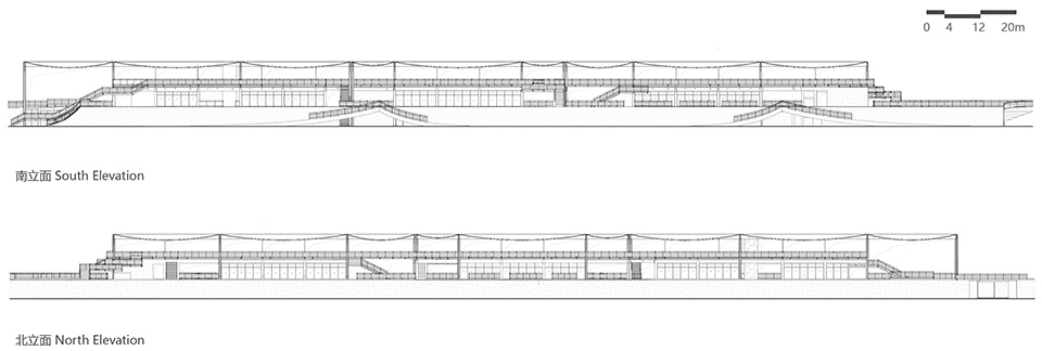 In response to the need to raise and widen flood walls when upgrading the seawall, the design reorganizes the site’s spatial configuration.The crest space was expanded to over 12 meters and multiple connectivity options were incorporated to transform the linear barrier into a circulation zone with multiple pathways.Parking functions outside the embankment were relocated to the southern end of the building, which is covered by a gently sloping roof that integrates seamlessly with the traffic flow on Hehe Avenue. Sports facilities were positioned at both ends of the site. The seawall space outside the embankment was repurposed as a public plaza.