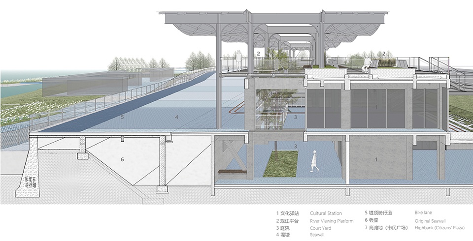 为最大化延续现有建筑的历史和物质价值,设计对其进行局部保留,置入院落与立体平台,结合海塘打造一处集基础设施、公共绿地和公共配套服务于一体的滨江公共场域。