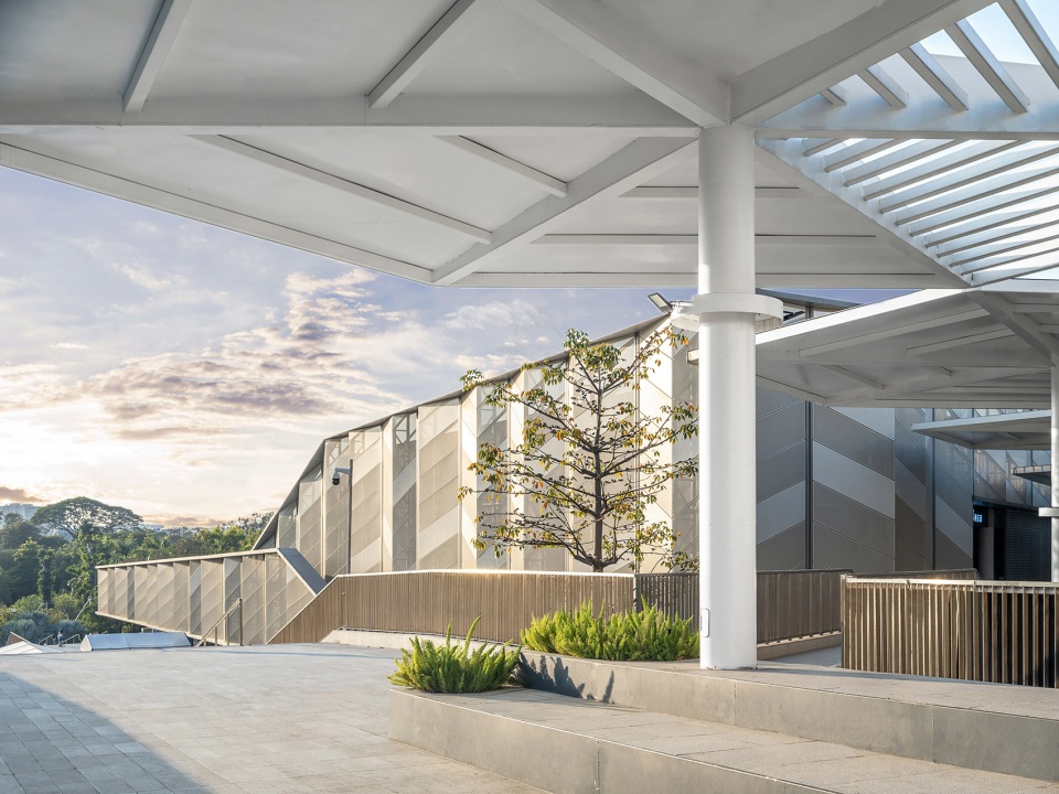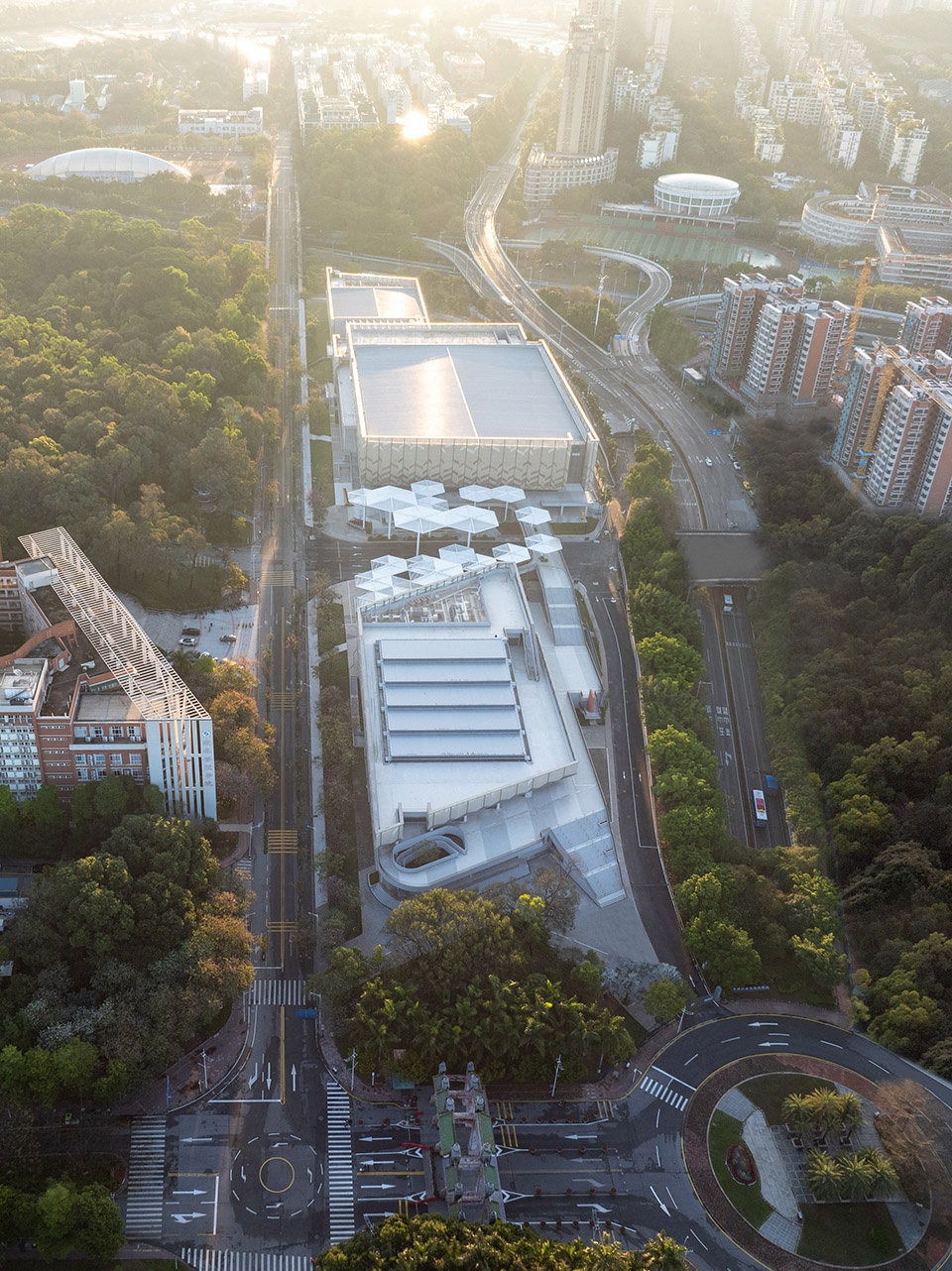 华南农业大学综合体育馆在开创性地采用了开放与社区化理念,设计打破了传统体育馆封闭的建筑界面,通过融合社区共享服务与社交的复合化功能,以及树伞广场、滑板场地、步行骑楼、多层次平台等户外空间,将体育馆打造为一个开放的校园运动与社区活动中心。该设计在提升场馆日常使用率的同时,使体育馆融入校园生活,并创造了充满活力的校园空间和新的场所记忆。