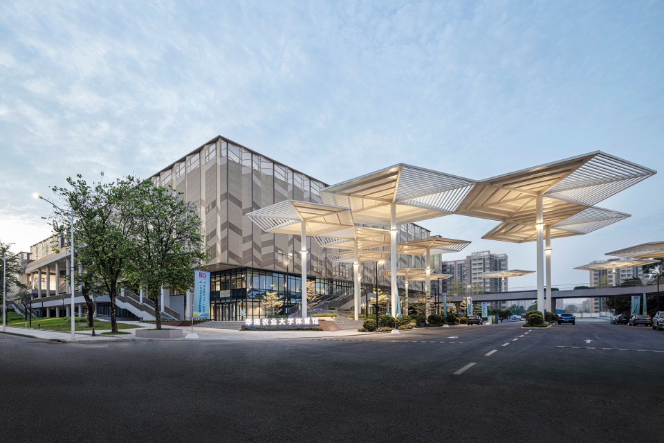 在比赛馆与游泳馆之间的街角处,斜向切割的建筑体量围合形成小广场,其中布置了滑板池、冷饮吧、休闲坐阶与休闲展廊,可以容纳运动、社团与各类自发的社交活动。广场上设置了20组伞状遮阳构筑物,形成了以树伞为主题的校园交往空间节点。树伞阵列以华南农业大学校徽中的“萌芽”元素为主题,布置于南北向通风廊道之中,它们适应亚热带地区日照强烈和多雨的气候,创造了全天候的户外活动场所。树伞在广场上创造丰富的光影与舒适的小气候环境,加上广场旁的休闲咖啡吧,这里平日吸引了学生与社区居民在其中运动、聚集、休憩与交流,也在校园中创造了一个承载师生记忆的标志性场所。