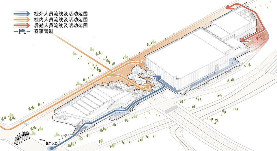 通过融合日常需求的功能布局,结合立体的交通组织、弹性可变的使用空间,在保证平时与赛时可切换的同时,充分提高了大学体育馆的利用率。