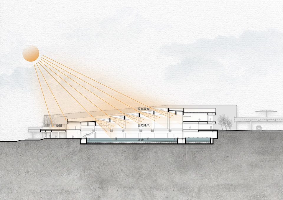 ▼采用自然采光与通风的游泳馆,漫射光营造了柔和的室内光环境,The swimming pool, which adopts natural lighting and ventilation, creates a soft indoor light environment with diffused light