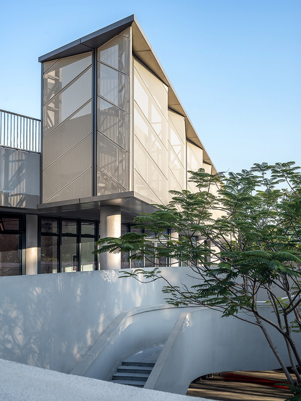 At the corner of the competition hall and natatorium, a diagonal building volume encloses a small square featuring a skatepark, cold drinks bar, stairs, and leisure gallery for sports and social activities. Twenty canopy-shaped sunshade structures inspired by the university logo’s “bud” motif create a tree-themed social hub. Adapting to subtropical climates, these canopies provide all-weather shade and microclimate comfort, enhancing daily interactions between teachers and students.