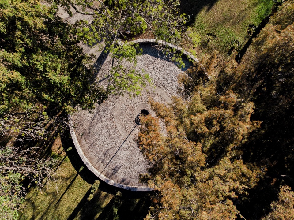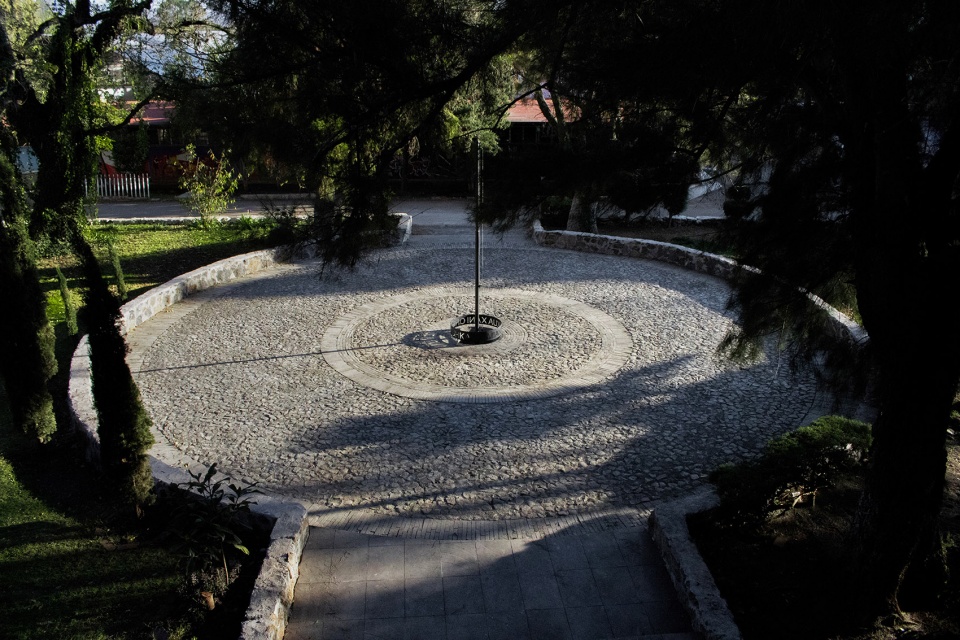 Three concentric circles are drawn across the ground like ripples in time, guiding the path toward the center: a steel ring inscribed in Purépecha with “Miantsïkua xani orhetkuhka”, “the most original memory.” This gesture embodies the idea that all learning, like every root, begins from a shared origin.