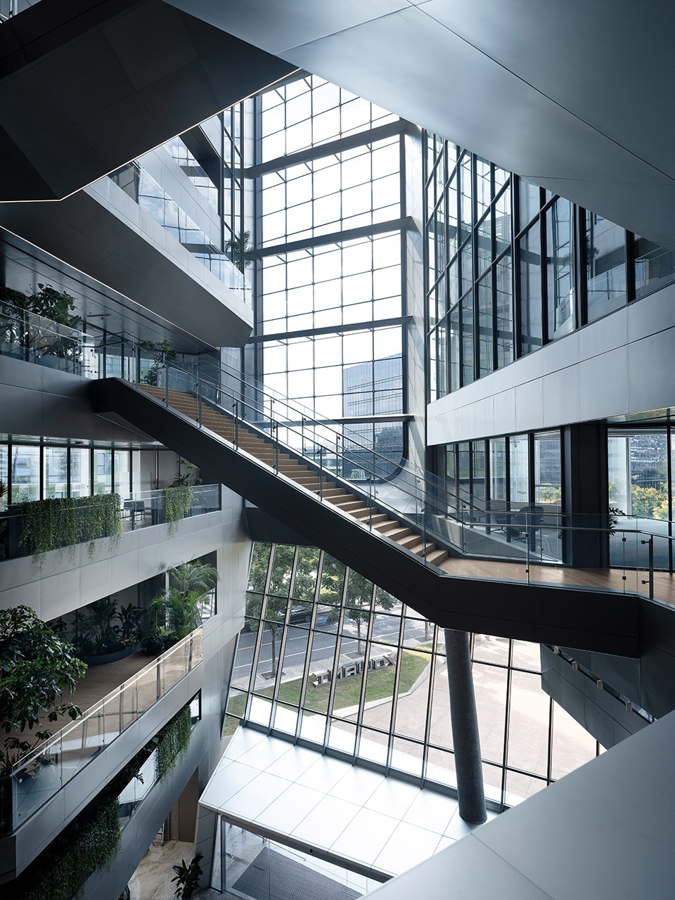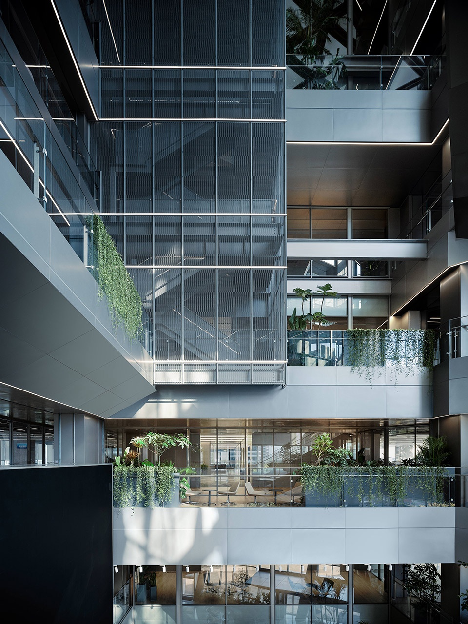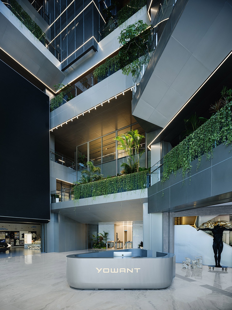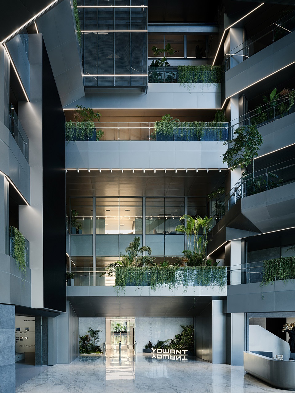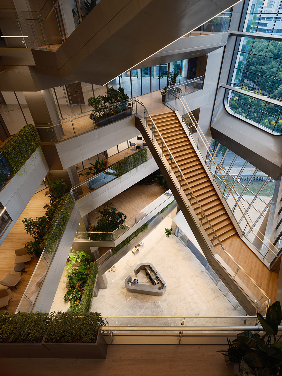 The Yaowang Building is located at the intersection of Lianchuang Street and Haiyuan Road in Hangzhou Future Science and Technology City, with a total building area of about 42,000㎡. The core challenge of this project lies in the ultra-high voids of the north-south double atrium, with the north atrium spanning 9 floors: how to resolve the physical barrier brought by the super-large vertical space spanning nine floors and north-south double atria. The design team transformed this “huge internal space” into a “vertical garden” for collaboration, communication and full of green plants. By adding staggered three-dimensional staircase systems and recessed pickaxes, the project added a natural and flexible feel to the originally neat space, finally achieving the goal of “efficient work while also needing a comfortable and natural environment”.