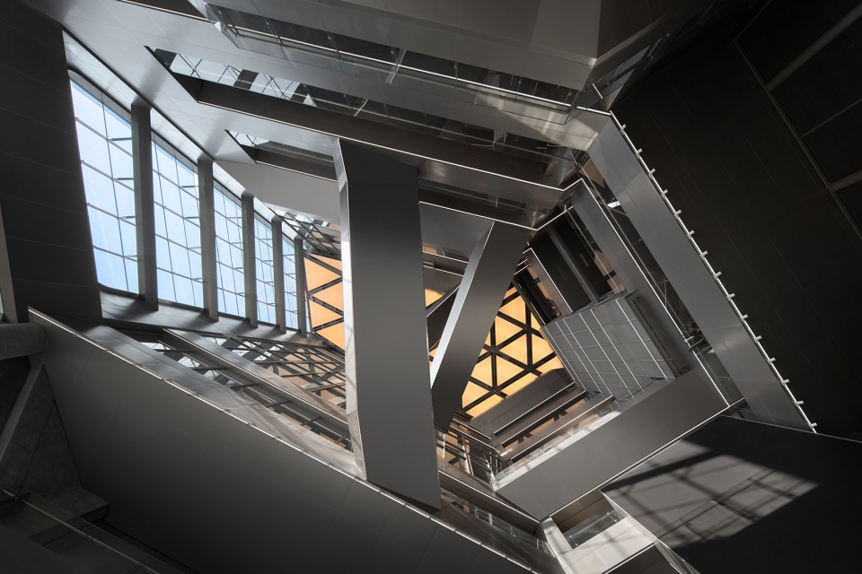本案的核心设计核心在于对交通核的重新定义。面对九层的北中庭超高挑空,单纯的空中连廊无法承担起高效协作的空间职能。设计师将传统连廊升级为一套“交错叠落的立体楼梯系统”,它不仅是一个高效连接上下楼层的交通工具,更是一个可以激发偶遇和短暂交流的非正式协作空间。