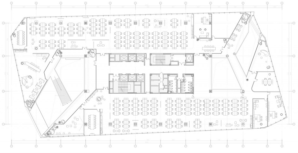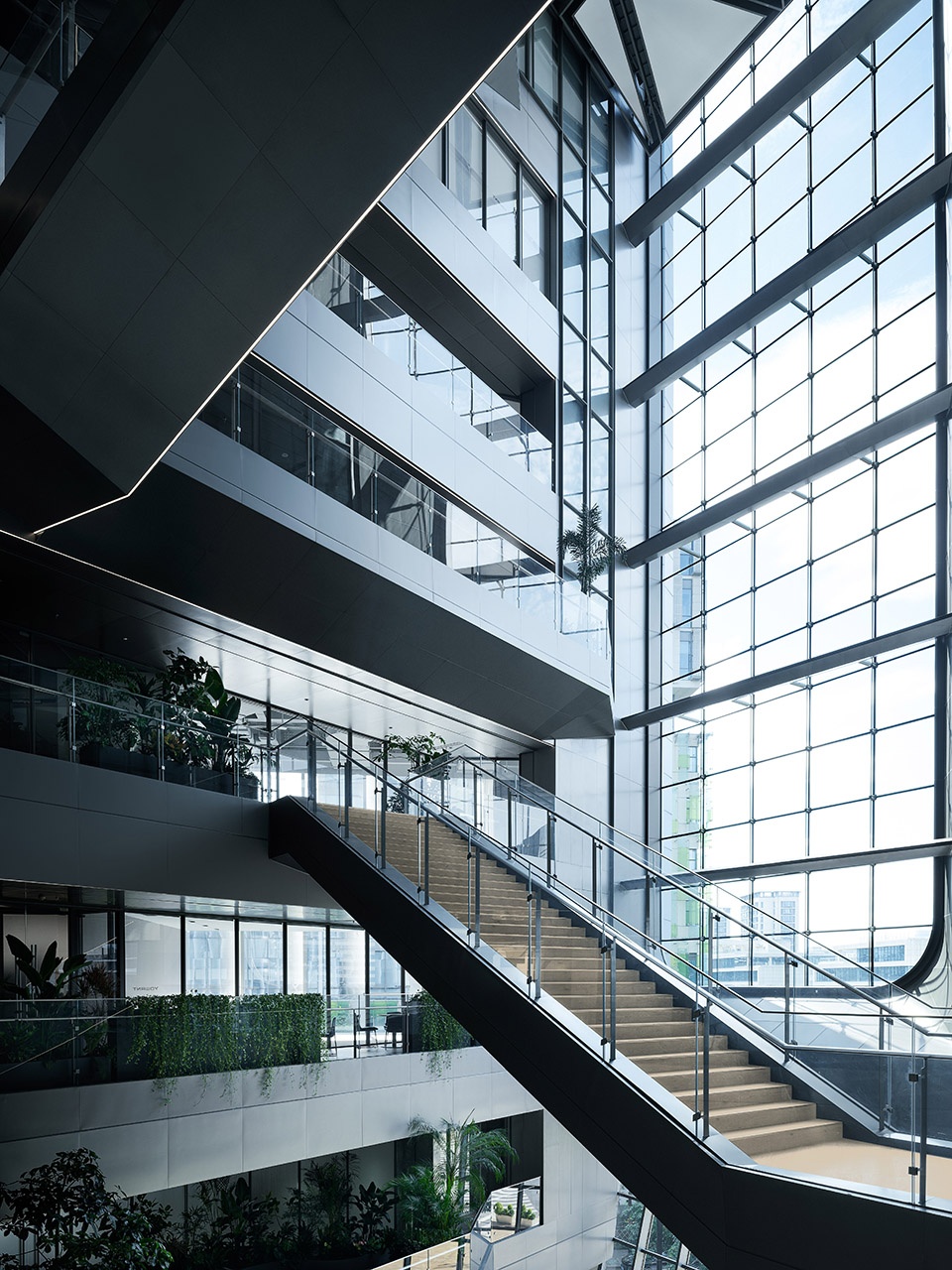 Increase the staircase volume and give it multiple functions: The staircase no longer hugs the core tube, but boldly extends to the atrium volume. The widened steps provide the possibility for people to stop and chat during up and down stairs, and the important platform nodes serve as extensions of vertical transportation, promoting interaction and connection between different floors.