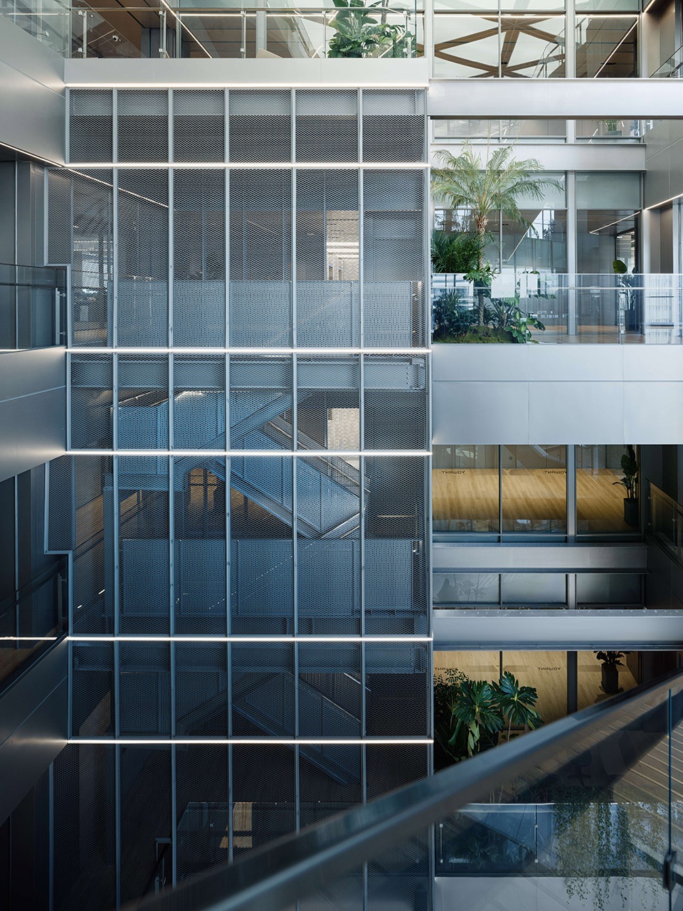 把金属、肌理漆和玻璃这几种材料搭配使用,避免了整个空间看起来太冰冷。肌理漆的质感比较柔和,正好可以中和掉金属和玻璃带来的尖锐感,让办公室看起来既专业,又舒服。穿孔金属网则作为中庭设计语言的延续,被应用于天花和隔断,这种半透明的材料既能隔开空间,又不会挡住视线,感觉很通透。
