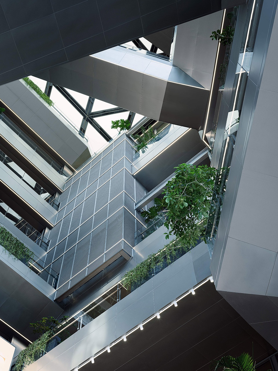▼仰望中庭的绿岛与结构,Looking up at the suspended green islands and architectural structure