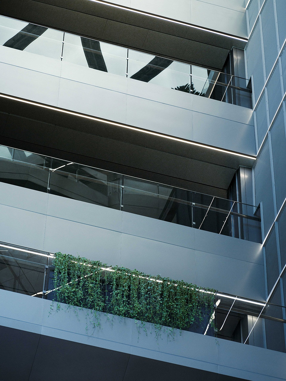Atrium railings: The railings are fully encased in stainless steel, with a soft metallic texture that forms a strong material contrast (Material Contrast) with the lush green plants growing in the atrium. Stainless steel not only protects the structure, but also becomes a carrier of light, color and reflections, dynamically reflecting natural ecological elements onto the rational framework of the building, achieving the fusion of industry and nature.